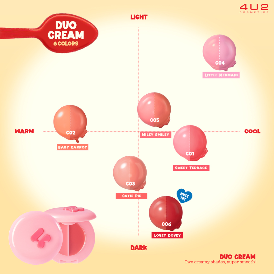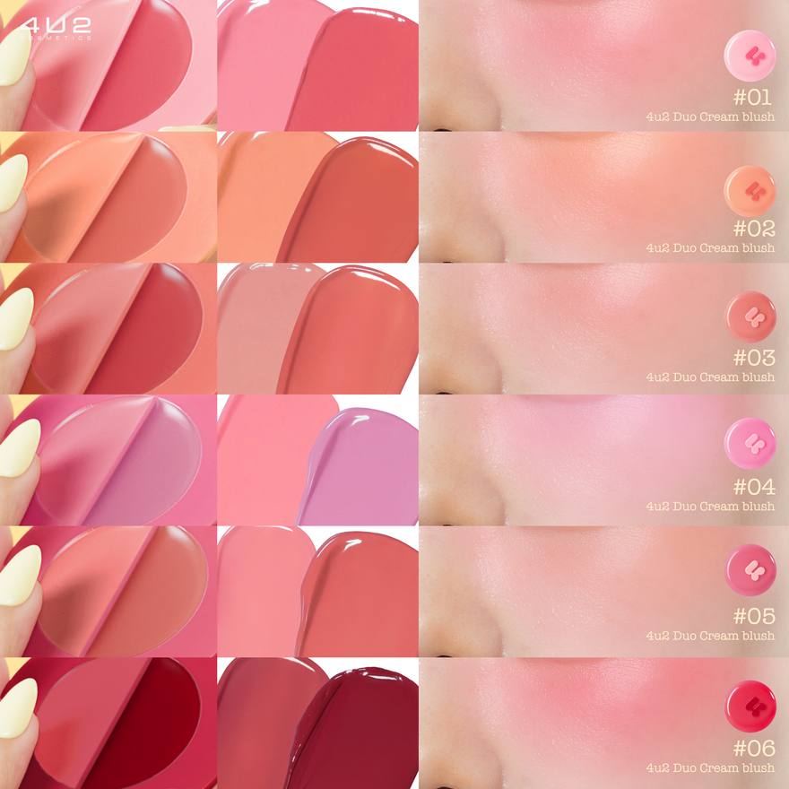 4U2 Duo Cream Blush a dual shade creamblush in one compact designed for easy blending that melts seamlessly into your skin Powered by lightweight LumiFilm Oil technology it adds a natural radiant glow to your cheeks This duo blush features two perfectly matched shades that can be used alone or mixed for customizable The creamy texture glides smoothly without caking or settling into fine lines delivering a fresh dewy finish It also your skin leaving it soft and hydrated for a healthy looking glow