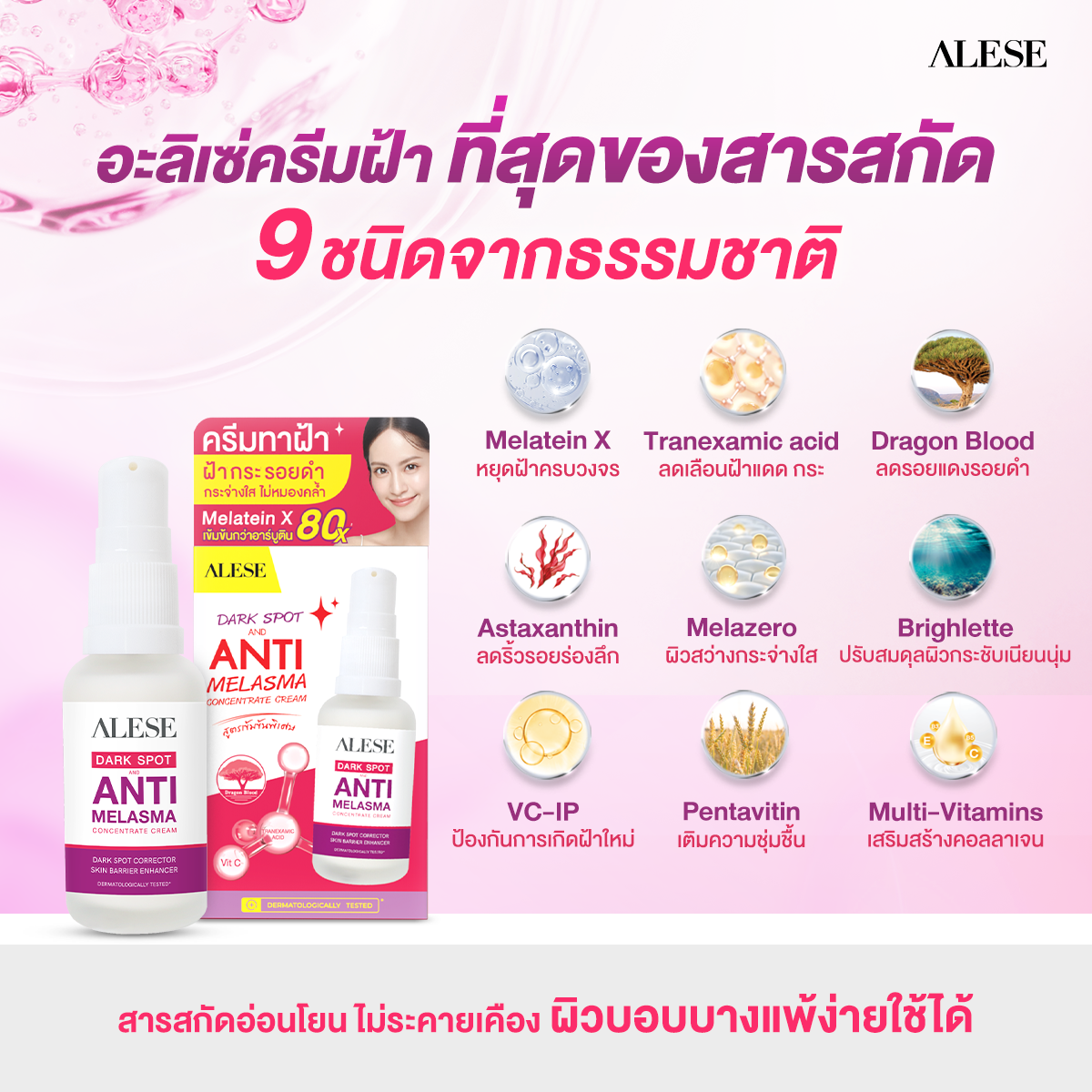 Alese Dark Spot and Anti Melasma Concentrate Cream, formulated to target dark spots, melasma, sun-induced pigmentation, and post-acne marks with gentle yet highly effective care. Developed by a professional Ramp;D team, this lightweight serum-cream absorbs quickly while delivering deep nourishment for clearer, brighter, and smoother-looking skin. The formula features Melatein X and Tranexamic Acid, two well-known ingredients that help reduce excess pigmentation and improve overall skin clarity. These actives work together to visibly lighten dark spots and promote a more even skin tone. Enriched with Multi-Vitamins (C, E, B3, B5), it helps restore moisture, boost radiance, and strengthen the skin is protective barrier, leaving the skin soft, hydrated, and revitalized. Alcohol-free and suitable for sensitive skin, this gentle formula has been Dermatologically Tested for irritation safety, making it ideal for daily use on all skin types.