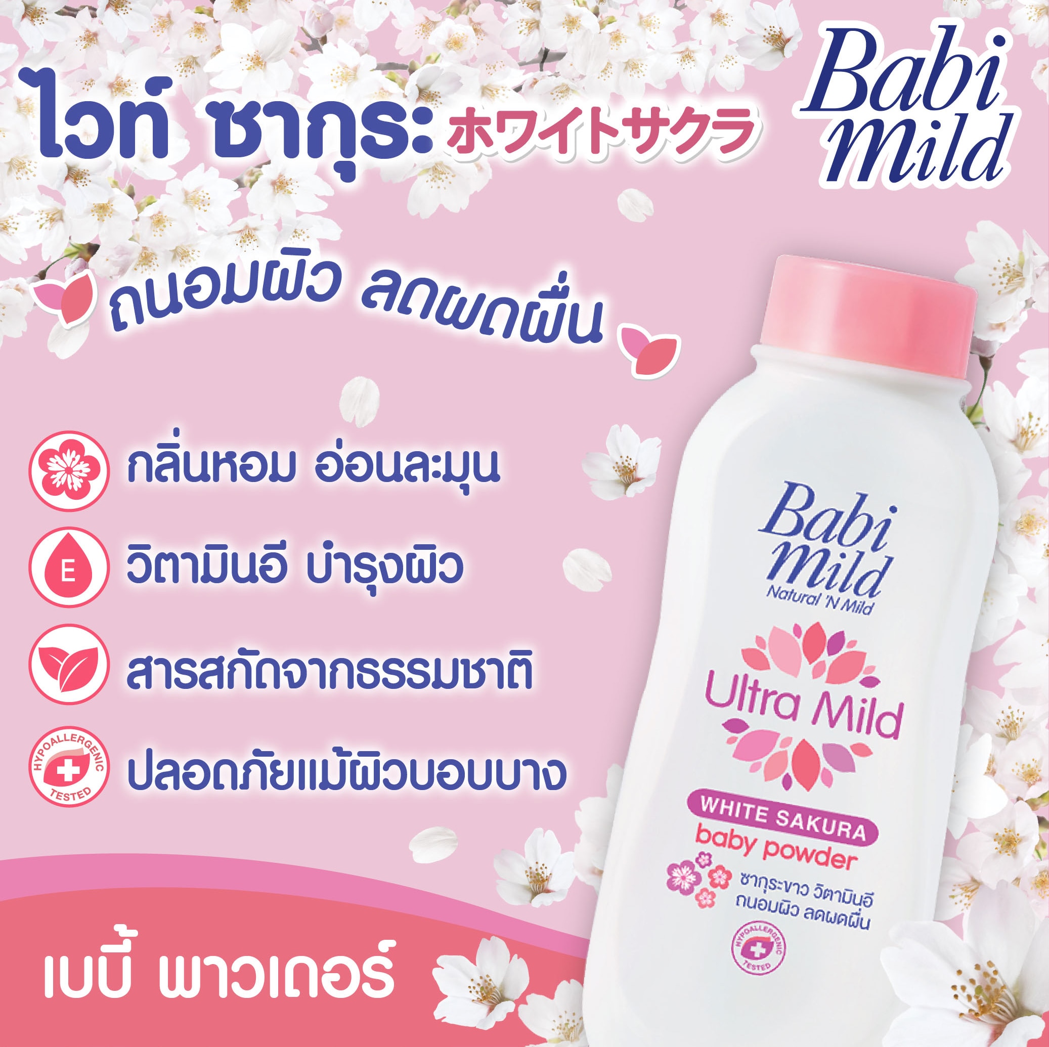 Babi Mild Ultra Mild Baby Powder White Sakura With Fine Texture Formulated With White Sakura Essence & Vitamin E To Nourish Skin And Prevent Irritation. Gentle And Mild To Skin With Delicate Scent From White Sakura. Certified By Hypoallergenic Test Gentle And Mild To Skin With Delicate Scent From White Sakura. External Use Only. Keep Away From Child'S Face To Avoid Inhalation, Which Can Cause Breathing Problems. Do Not Apply To Genital Area. Avoid Contact With Opened Wound. Discontinued If Irritation Develops And Consults Doctor. Keep Out Of Reach Of Children.