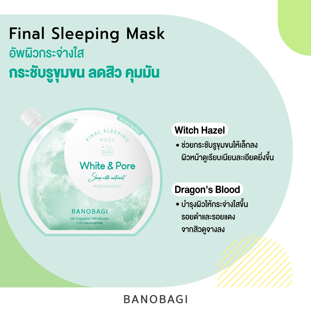 Banobagi Final Sleeping Mask White & Pore is filled with Double Trapping technology and effectively ingredients that are nutritious and effective to promote skin health. It contains Dragon Blood, Witch Hazel, Tea Tree, and Salicylic that effectively restore skin balance and minimize pores, revealing healthy & smooth skin, and also preventing future breakouts. Skincare for Thais, formulated by BANOBAGI hospital dermatologist from South Korea. Safe for sensitive skin, No Fragrance, No Silicone and 20-Chemical Free