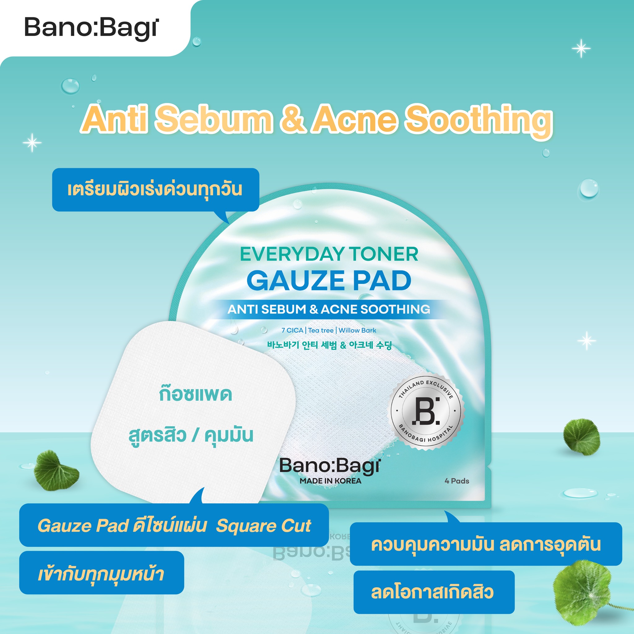 Banobagi Toner Gauze Pad Anti-Sebum and Acne Soothing. Developed and researched by Banobagi Hospital, Korea. Suitable for oily, acne-prone, and sensitive skin. Helps soothe and calm the skin with 7-Cica Complex and Tea Tree Oil to control excess sebum, reduce acne, redness, and dark spots. Willow Bark Extract gently reveals clearer skin. The gauze pad is specially designed for oily and acne-prone skin. Lightweight, breathable, and non-irritating. Gentle on sensitive skin, safe to use during pregnancy or breastfeeding, and free from 21 irritating ingredients.