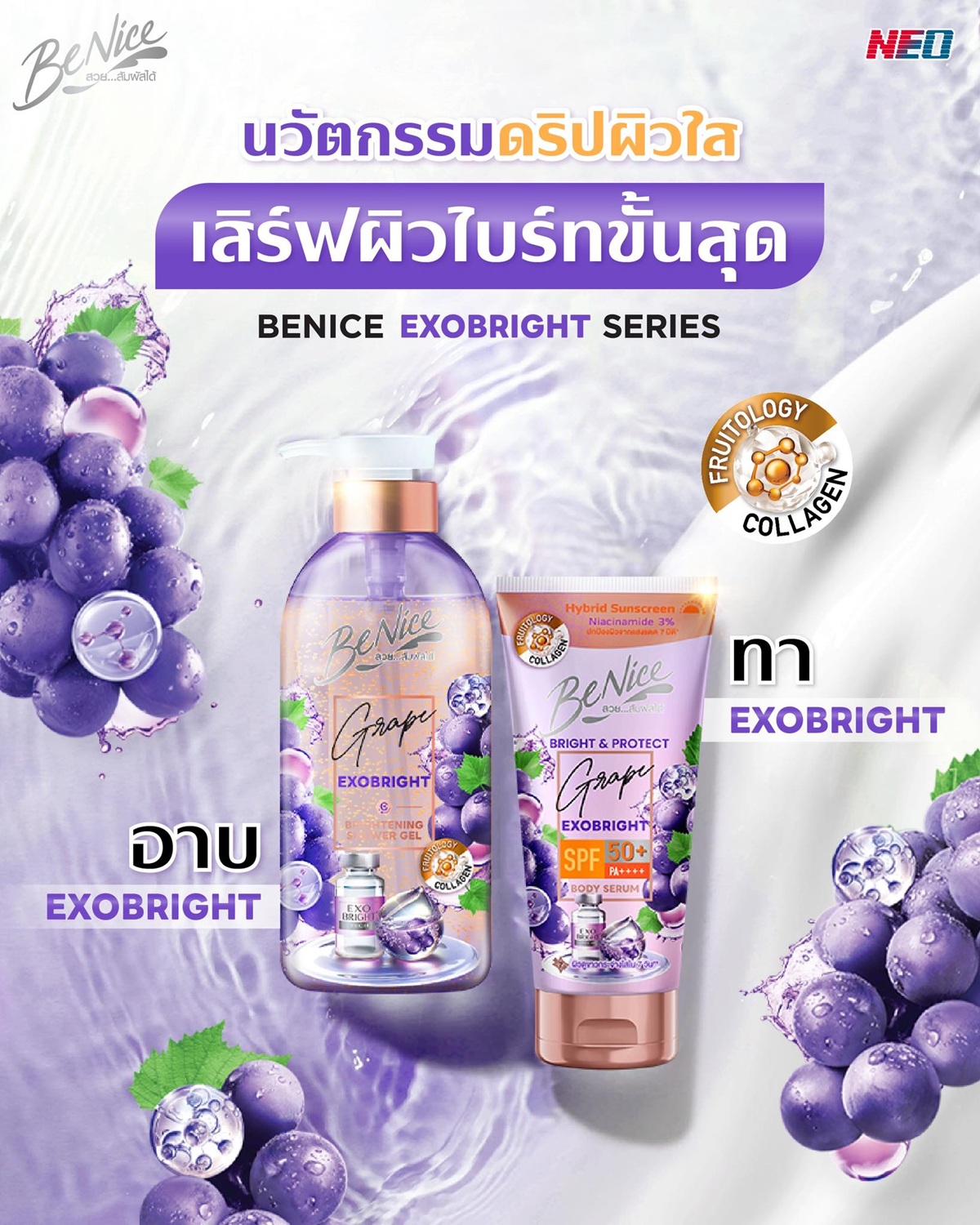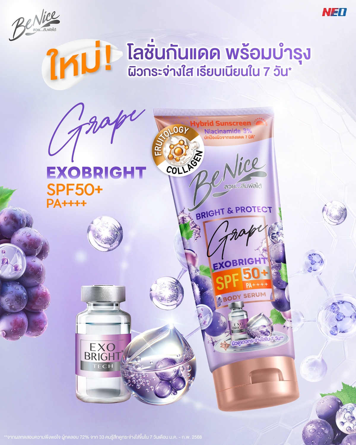 Benice Body Serum Grape Exo Bright is a nourishing body serum that protects your skin from harmful UV rays with SPF 50+ PA++++. Enriched with powerful Exo-Bright technology, it deeply nourishes the skin while grape extract, rich in antioxidants, helps to restore and brighten dull skin. Reveal visibly more radiant and healthier-looking skin in just 7 days with regular use. Lightweight, non-sticky, and suitable for daily use. According to appreciated questionnaires, 72 of 33 subjects felt their skin looked brighter in 7 days during January - February 2025.