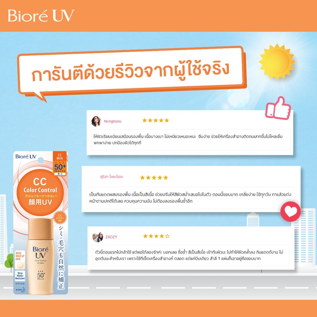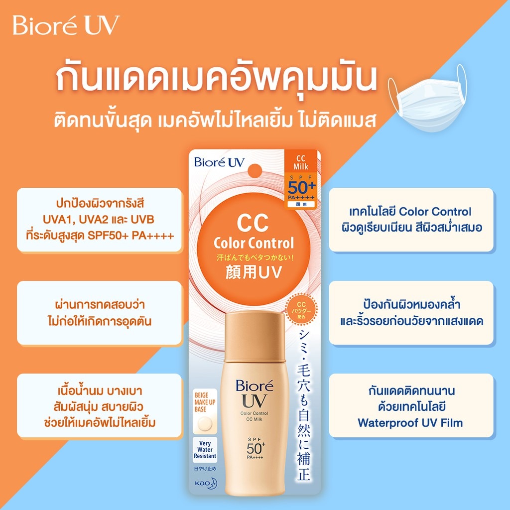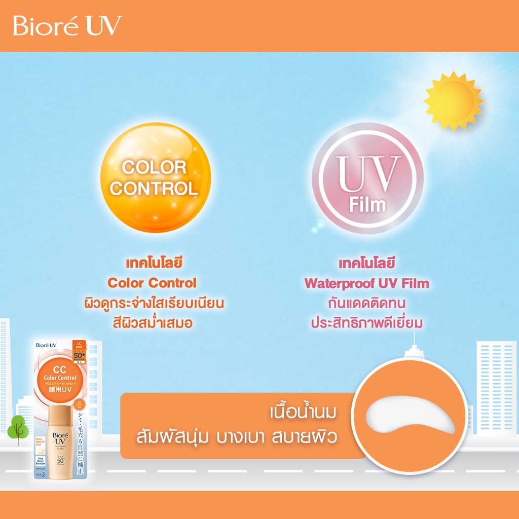 Biore UV Color Control CC Milk SPF50+/PA++++ Milky lotion in beige color which provides 3 benefit in1 step 1.With Collagen help to nourishing skin and wrinkle protection 2. Highest UV and pollution protection
