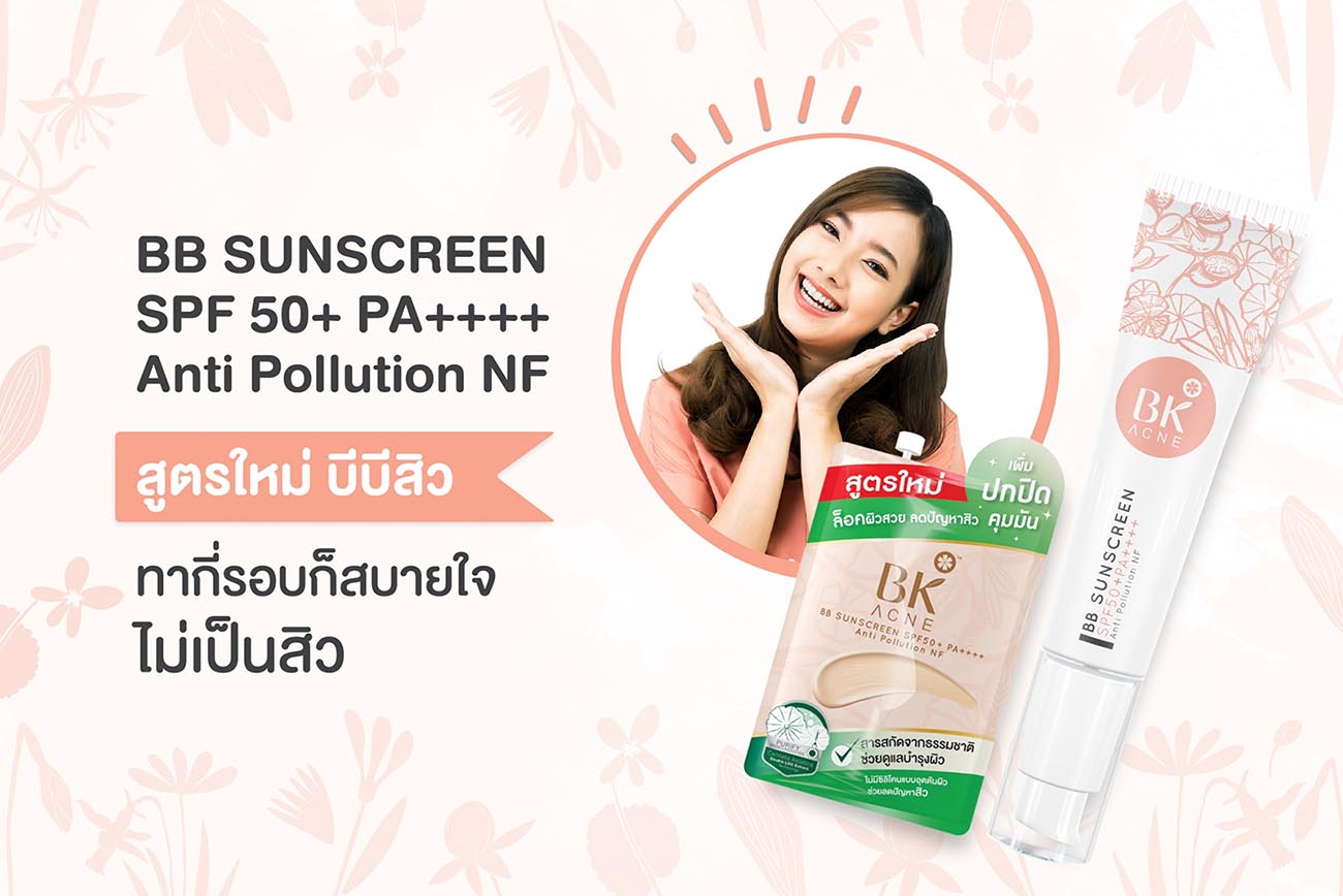 BK Acne BB Sunscreen protects the skin from UVA, SPF50 + PA ++++ togerter with Non-Comedogenic Silicone Formula form America. Does not cause acne, does not clog the pores with special properties from the Anti Inflammatory Complex that helps dark circles and acne redness look faded. enriched faster Pollu Shield as' Second skin protects the skin from pollution faced during the Sunsmart UVC-E to help restore skin to damaging UV rays quickly and Thermus thermophilus Ferment m. Features an anti - oxidant skin look younger.