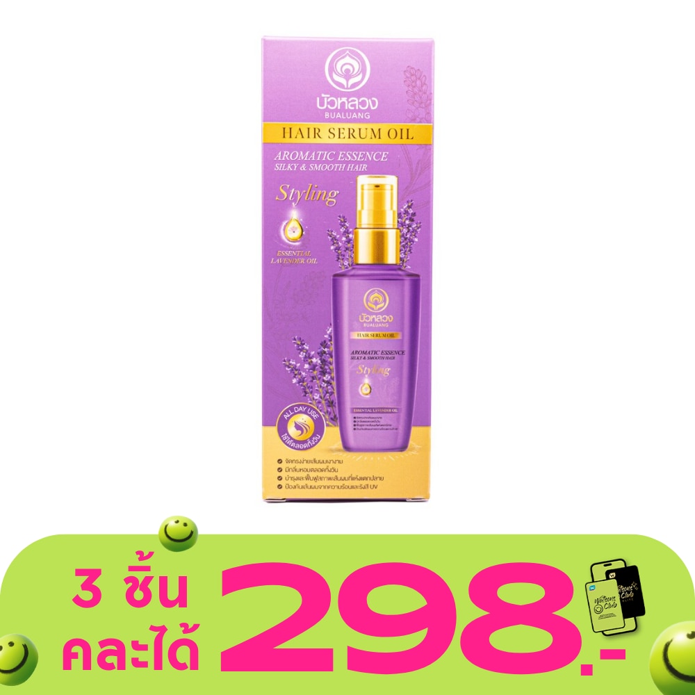 Bualuang Hair Serum Oil For Silky And Smooth (Lavender Essential Oil) with premium lavender essential oil and vitamin E from natural, which help and repair your damaged hair from chemical, heat, pollution and sunlight. The premium ingredients are easily penetrate to your hair follicles from root to tip and restore lost moisture. After using Bualuang hair serum oil, your hair assume to become smooth, silky and anti-frizzy hair even after a single use. Moreover, the aromatic scent from lavender essential oil is provided all day, specially selected for you.