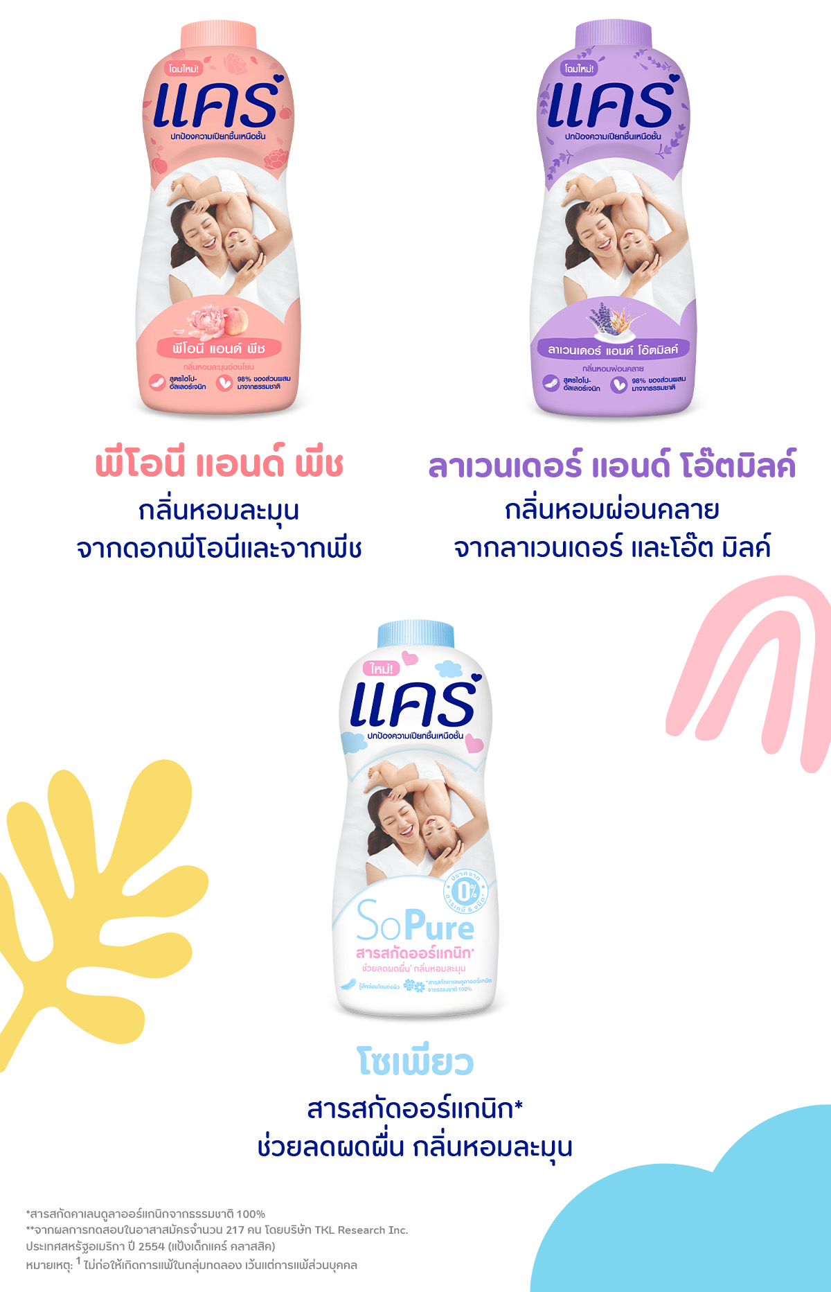 Care Talcum Classic Care baby talcum consists of hypoallergenic formula which has been approved by American Dermatological Association that the product is gentle, non-irritate, and hypoallergenic, so it is safe for sensitive skin like baby's one. Care Hi-Kamin helps alleviate rash from wetness, soothing the baby's skin. With natural extract from turmeric, providing gentle nice fragrance. Not causing allergic reaction in the test study group except the individual allergic reaction. from the study with 217 volunteers by TKL Research Inc. USA 2011