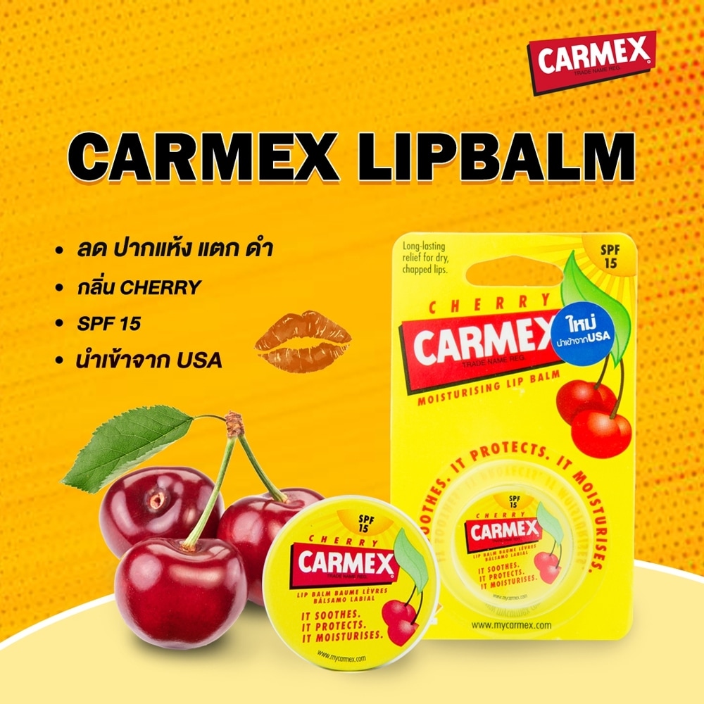Carmax Moisturising Lip Balm Cherry SPF15 Lip balm with a cherry-flavored case with SPF15 (Jar) with a cherry-flavored case with SPF15 to protect the lips. Provides long-lasting protection to help maintain hydrated lips. And relaxes the lips, contains a mixture of camphor and menthol Helps to prevent dry, cracked, black lips.