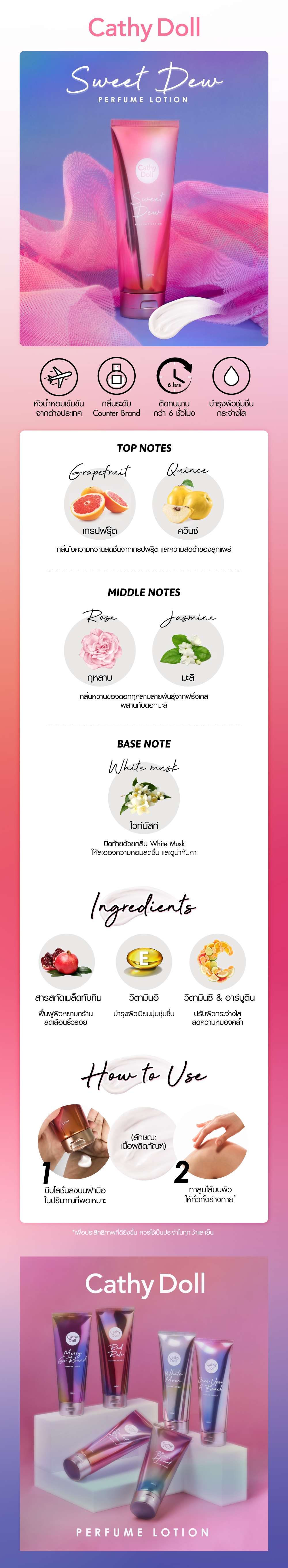 Cathy Doll Perfume Lotion Sweet Dew Body lotion Which combines the fresh scent of sea water with the warmth of myrrh Filled with the scent of sea bergarmot, lemon grapefruit, and the scent of various trees. Like lavender, rosemary, combined with aromatic and amberwood notes Become a perfume lotion that awakens your energy and enchantment. Enriched with extracts of Punica Pranatum Seed Oil to revitalize rough skin. Reduce wrinkles, combine Tocopherol to nourish the skin smooth, soft and moist. It also contains Ascorbic Acid and Arbutin to help brighten the skin. Reduce dullness Reveals a smooth and moist body skin. Comes with a long-lasting fragrance that lasts all day long.