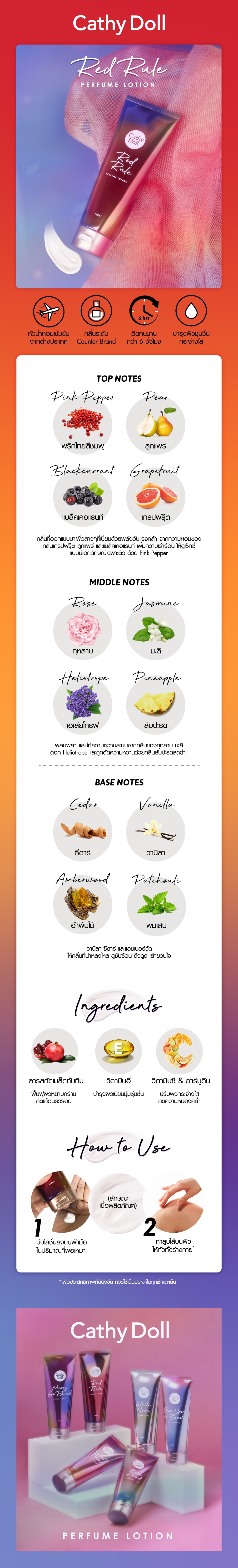 Cathy Doll Perfume Lotion Red Rule Body lotion Which combines the fresh scent of sea water with the warmth of myrrh Filled with the scent of sea bergarmot, lemon grapefruit, and the scent of various trees. Like lavender, rosemary, combined with aromatic and amberwood notes Become a perfume lotion that awakens your energy and enchantment. Enriched with extracts of Punica Pranatum Seed Oil to revitalize rough skin. Reduce wrinkles, combine Tocopherol to nourish the skin smooth, soft and moist. It also contains Ascorbic Acid and Arbutin to help brighten the skin. Reduce dullness Reveals a smooth and moist body skin. Comes with a long-lasting fragrance that lasts all day long.