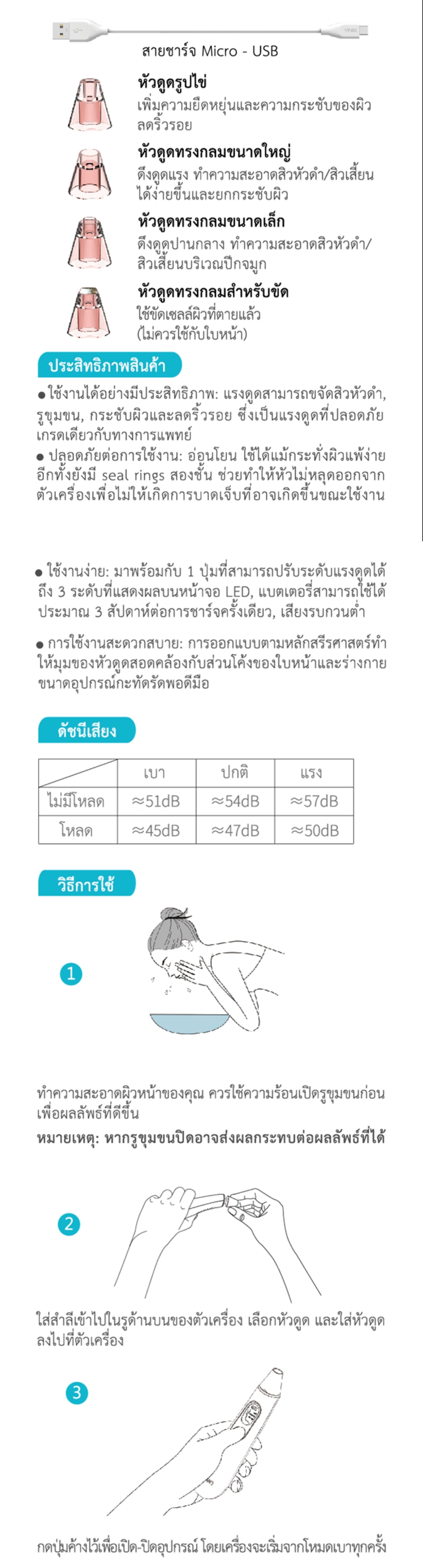 XPRE111 - Blackhead Removering Devices helps in cleaning pores. It can suck out comdonea and blackheads easily and effectively within a second. It can also lift up skin (finelines) on the cheeks. Model: XPRE111 Battery Voltage: 3.7VDC Electric Current: 0.55A Water protection Level: IPX0 Material: ABS Shell Size: 4*4*18cm Weight: 127g Battery Usage: up to 3 hours Interface: 1 buttons with LED screen