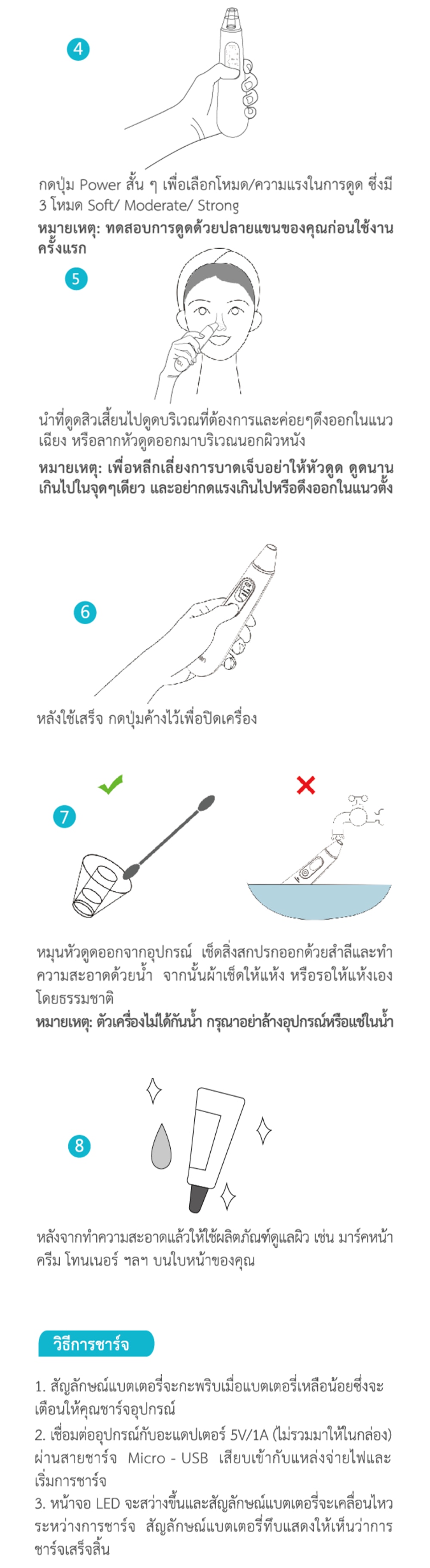 Choose the sunction level that suit your skin and gently drag down the machine to remove blackheads and comdone. Gently drag up to reduce fineline.