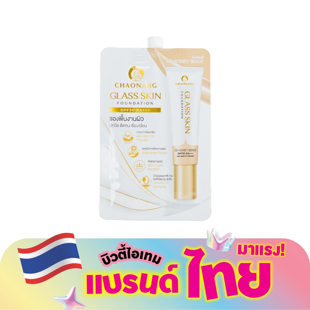 Apply Chaonang Glass Skin Foundation on 5 points on the face,forehead ,nose,chin and both cheeks and then spread evenly over the face.