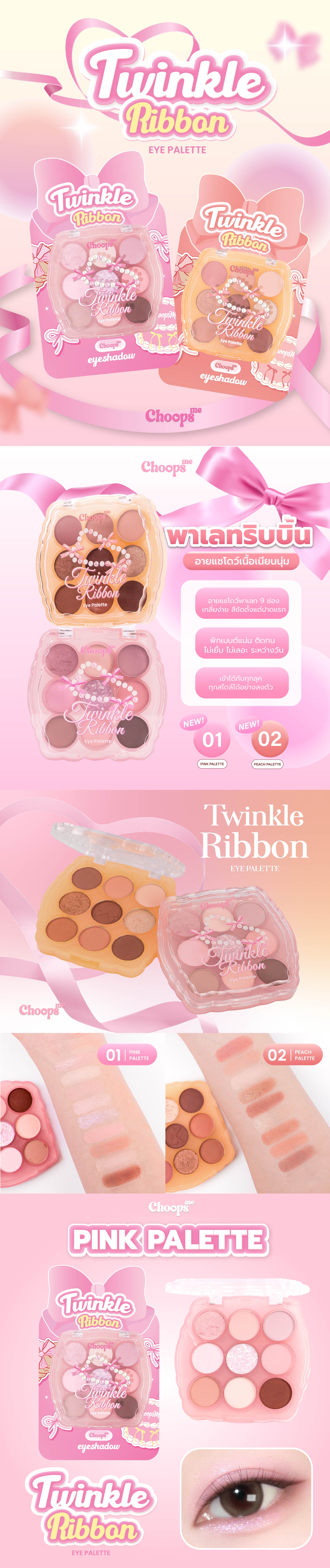 Choops me Twinkle Ribbon Eyeshadow Pink palette, ,used to look like a juicy Korean girl, easy to use, no matter how beautiful you apply. There are 9 colors to choose from, including matte colors, glitter colors and shimmer colors. The pigments are sharp, easy to blend, and you get a beautiful color with just a little application. Make your eyelids look sparkling. The glitter is more alluring. Eye shadow is a very easy to use tool, just choosing your favorite color and the tone of your makeup will make you look better. Help make the eyes look clear, charming, look outstanding on the face, clear color, lasting during the day, easy to carry, can be used daily and every opportunity you want.