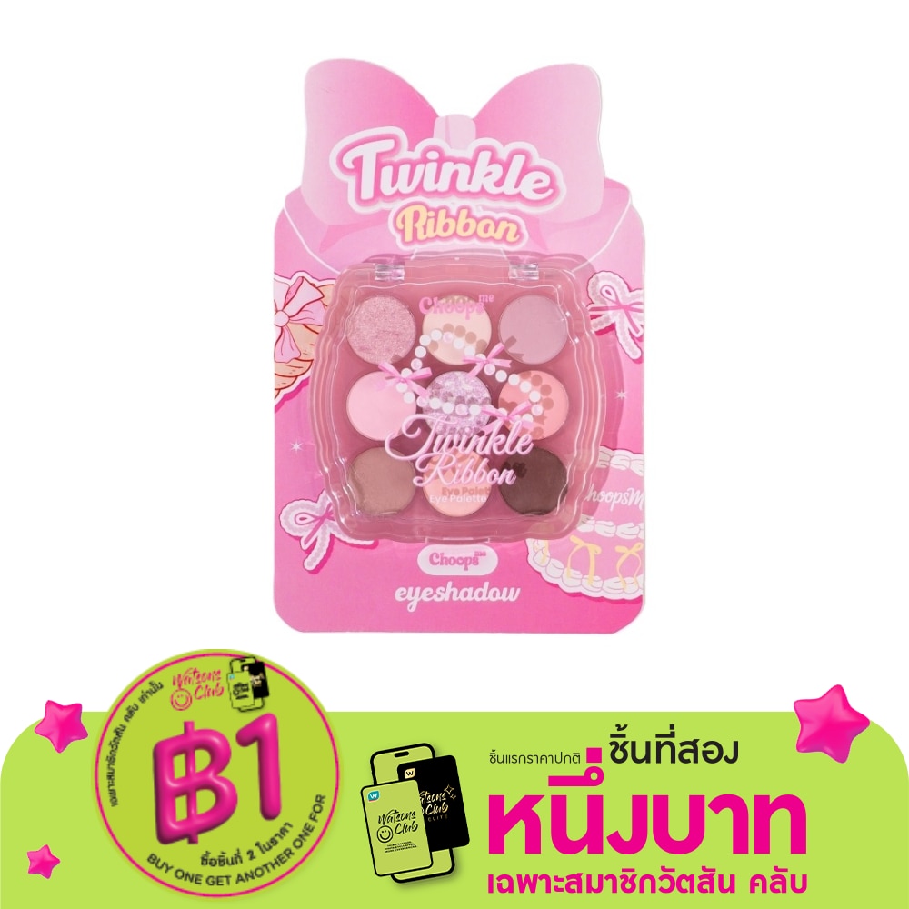 Choops me Twinkle Ribbon Eyeshadow Pink palette, ,used to look like a juicy Korean girl, easy to use, no matter how beautiful you apply. There are 9 colors to choose from, including matte colors, glitter colors and shimmer colors. The pigments are sharp, easy to blend, and you get a beautiful color with just a little application. Make your eyelids look sparkling. The glitter is more alluring. Eye shadow is a very easy to use tool, just choosing your favorite color and the tone of your makeup will make you look better. Help make the eyes look clear, charming, look outstanding on the face, clear color, lasting during the day, easy to carry, can be used daily and every opportunity you want.