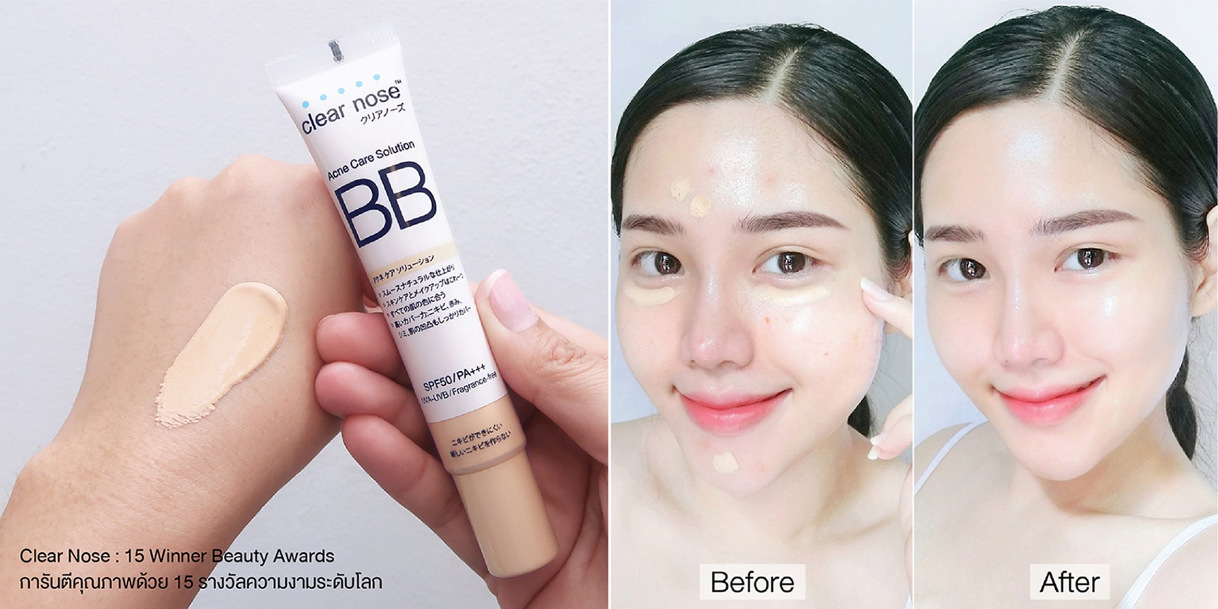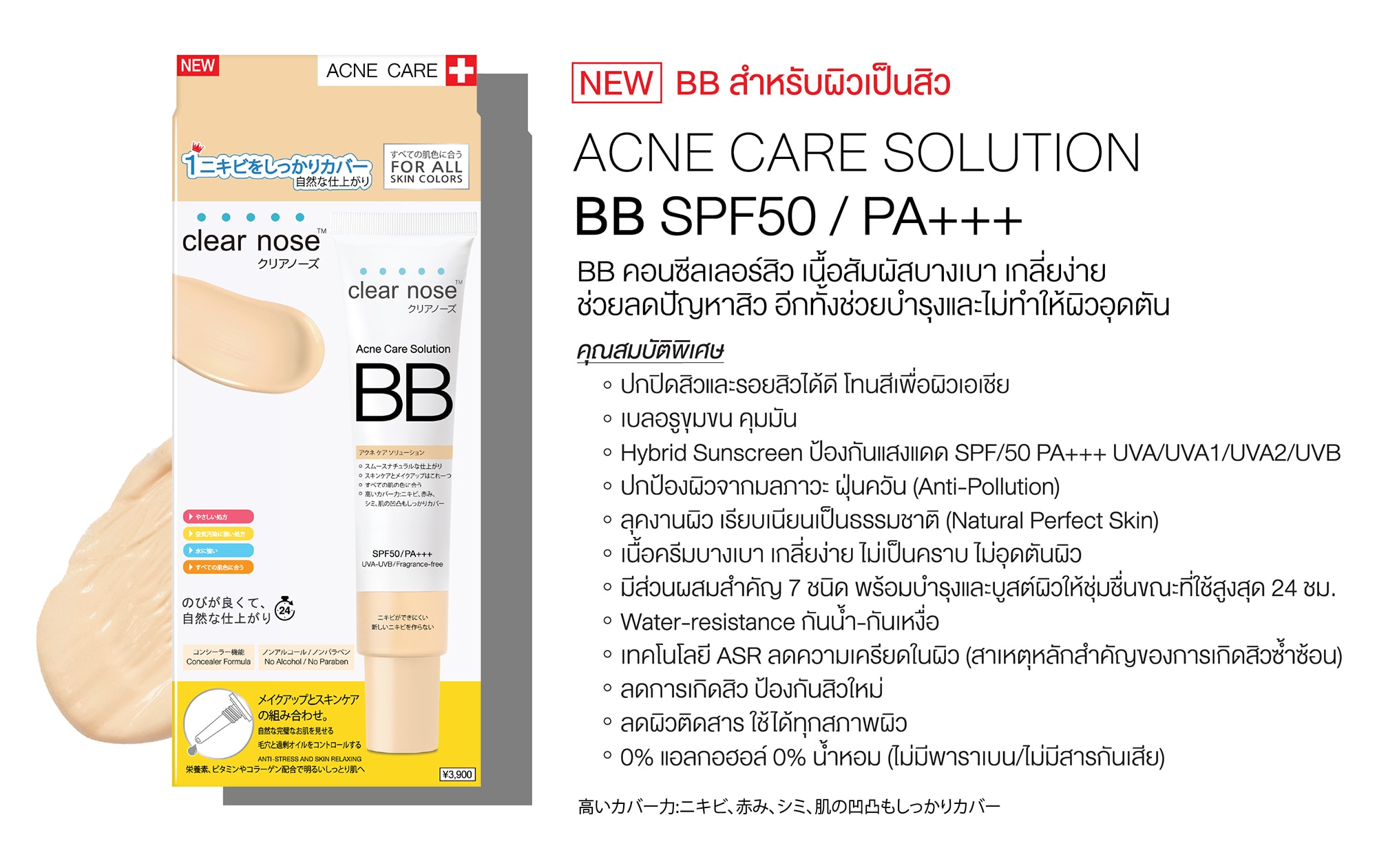 Clear Nose Acne Care Solution BB SPF50 PA+++ The perfect combination of Makeup and Skin Care, is suitable for acne-prone skin. Easy to blend, light touch, non-comedogenic, natural coverage and prevent new acne formation. Clear Nose Acne BB has the Anti-stress and skin relaxing properties. It also includes antioxidants and a complex of nutrients, vitamins and collagen. With Hybrid sunscreen technology, It protects skin from Pollution and SPF50 PA+++ UVA1 UVA2 UVB For all skin colors (Auto color adjustment)