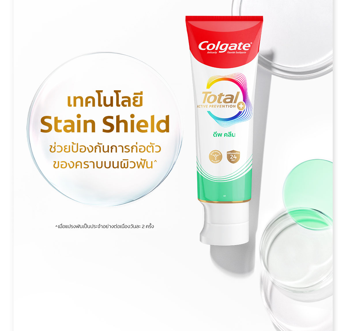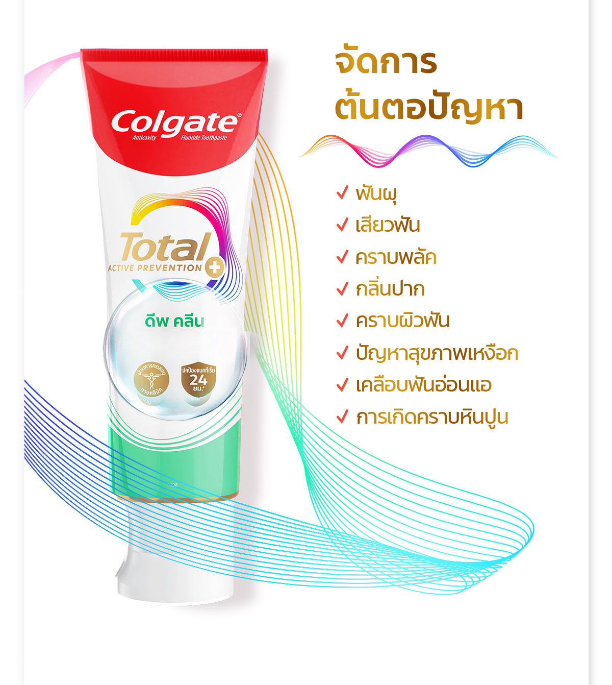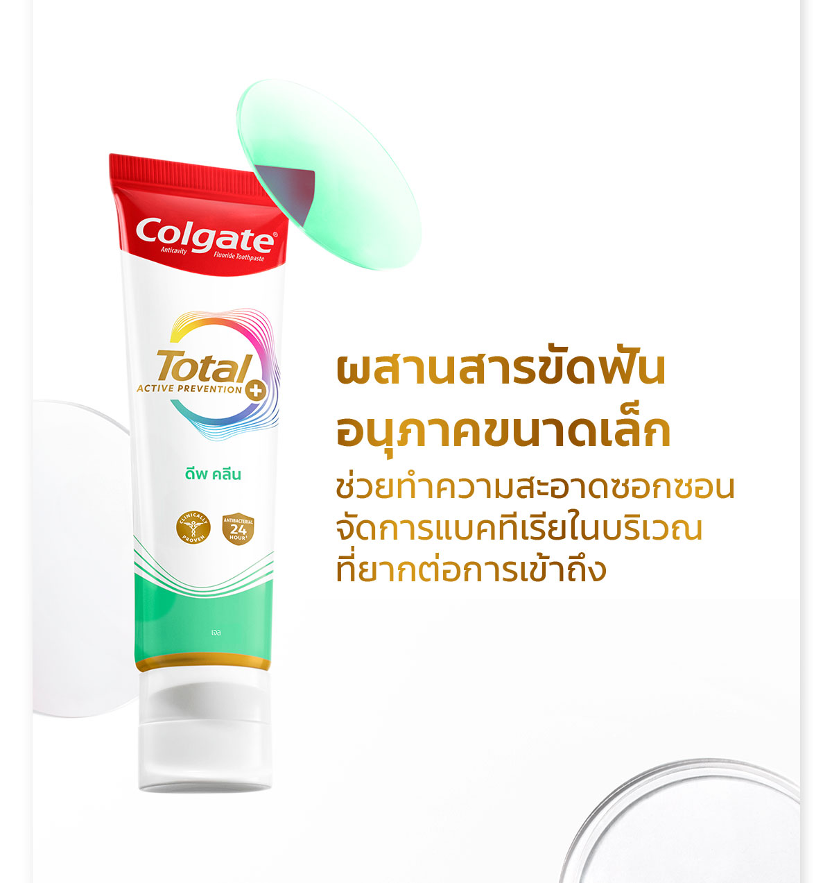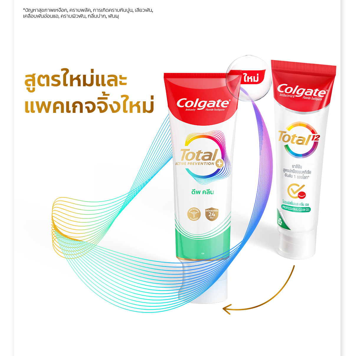 For a bright and confident smile, you need to start with a deep clean of your whole mouth. Thats why new Colgate Total Professional Clean Gel toothpastes active cleaning formula, with polishing micro-particles, not only fights plaque between teeth and in all those hard to reach spaces but also reduces fights bacteria on your tongue, cheeks, and gums for 12 hours. For a bright and confident smile, you need to start with a deep clean of your whole mouth. Thats why new Colgate Total Professional Clean Gel toothpastes active cleaning formula, with polishing micro-particles, not only fights plaque between teeth and in all those hard to reach spaces but also reduces fights bacteria on your tongue, cheeks, and gums for 12 hours.