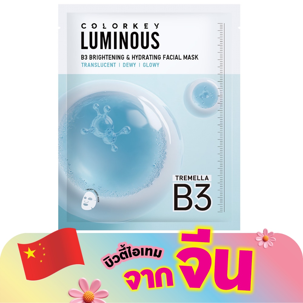 Colorkey Luminous B3 Brightening amp; Hydrating Facial Mask 30 ml. 1 piece. With a new breakthrough brightening essence formula, containing 2percent Niacinamide, Alpha-Arbutin, 8D HA, Tremella and Milk Extract Helps skin to be bright and smooth like milk Provides moisture amp; brightens: Provides deep moisture, improves dull skin condition, leaving skin clear and radiant. Exclusive patented ingredients: Enhances the effectiveness of brightening ingredients, evens skin tone and reduces dark spots. Penetration technology: Enhances the absorption of brightening essence, leaving skin radiant and bright when used daily. Full of essence Uniform tencel membrane fabric, enhances the absorption of nutrients. 3D cutting technology Design hugs the contours of the face, suitable for most face shapes.