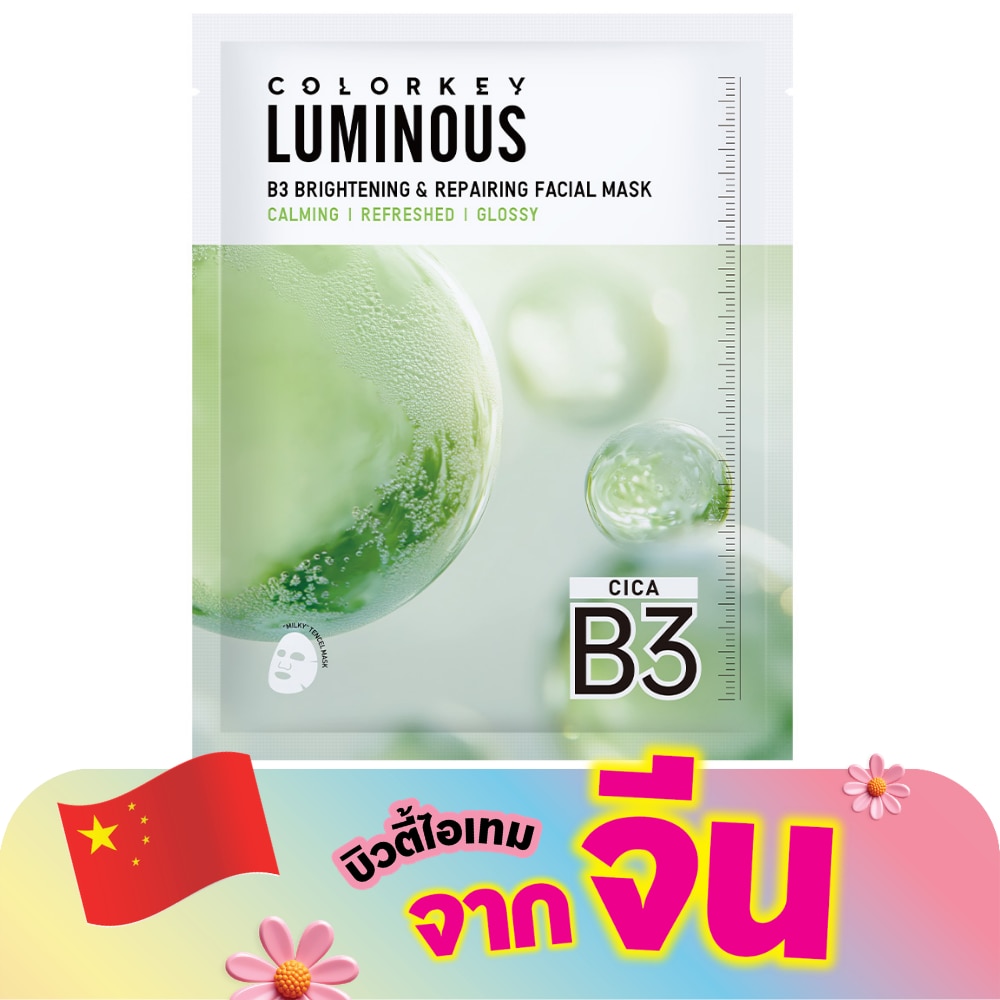 Colorkey Luminous B3 Brightening amp; Repairing Facial Mask 30ml. 1 piece. With a new breakthrough brightening essence formula, containing 2percent. Niacinamide, Alpha-Arbutin, 5X Ceramide, 4X CICA and Milk Extract Helps skin to be bright, smooth like milk Helps moisturize, restore amp; support skin soothing. Patented ingredients: Enhance the effectiveness of brightening ingredients, even skin tone and reduce dark spots. Penetration technology: Enhances the absorption of brightening essence, helps skin to be radiant and bright when used daily. Full of essence: Uniform tencel membrane fabric, helps enhance the absorption of nutrients. 3D cutting technology Design hugs the contours of the face, suitable for most face shapes.