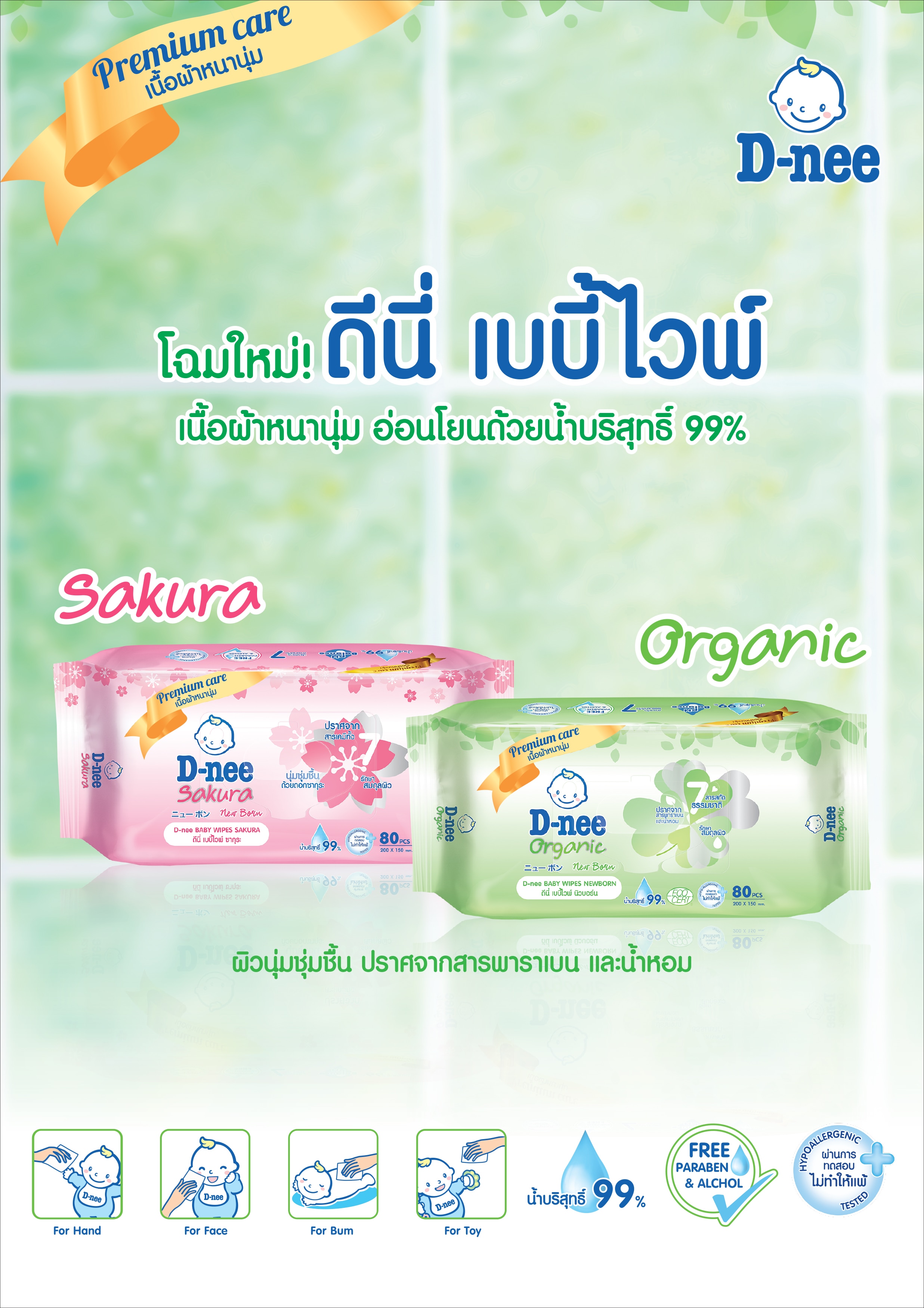 D-Nee Baby Wipes Sakura have been specially developed to baby's sensitive skin with Sakura extract, Purified water, pH Balance, Paraben free, Alcohol free, Fragrance free and Color free. Ideal for baby's cleansing with thick & soft wipes and restore skin moisturizer. Ensure no skin irrtation (HYPOALLERGENIC Tested)
