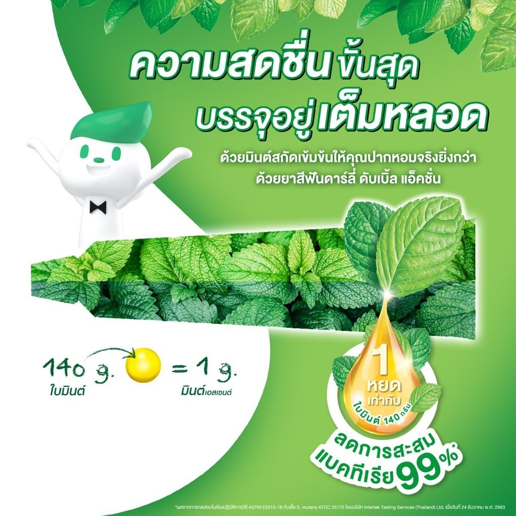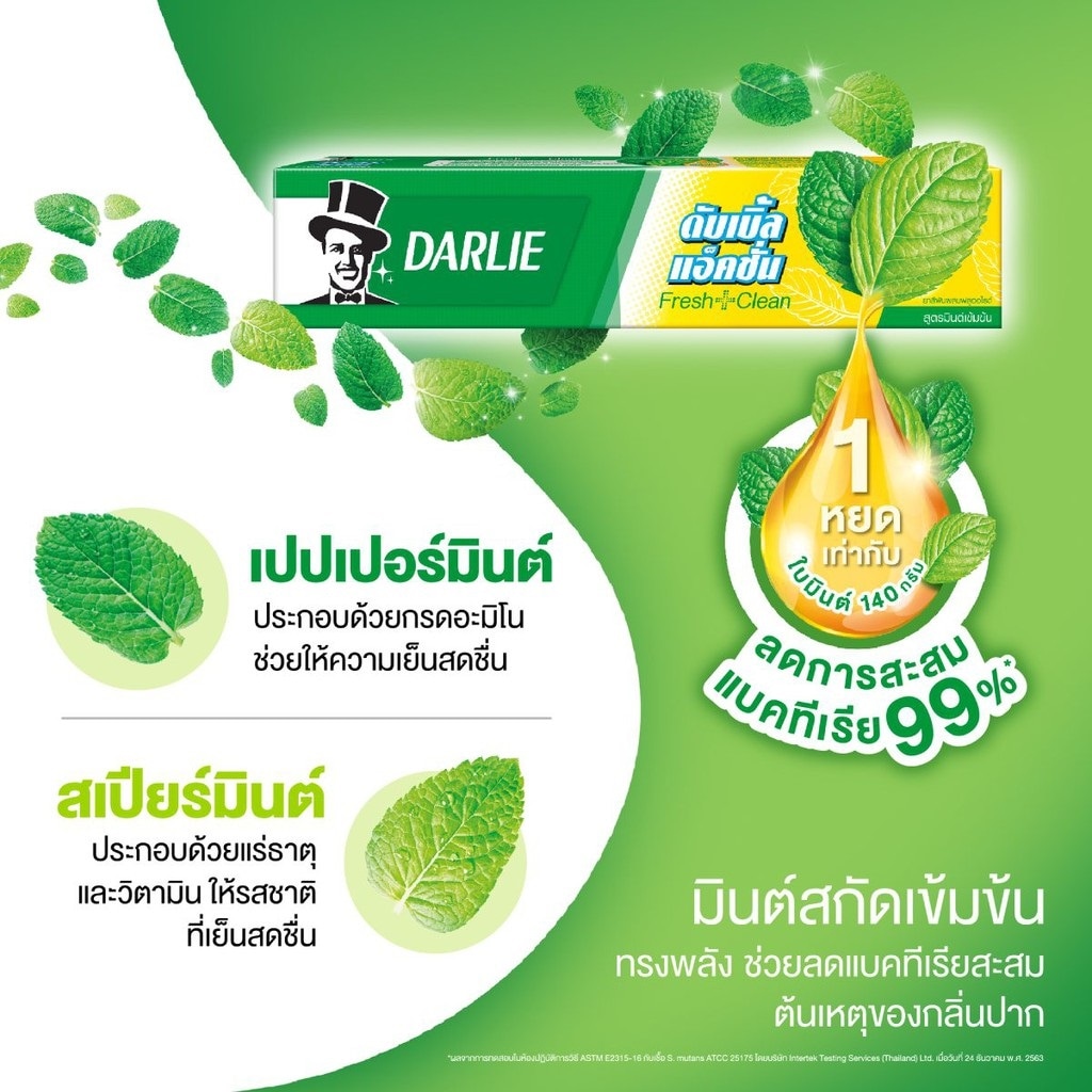 Darlie Toothpaste Double Action Double Mints essenses helps reduce oral bacteria accumulation 99% for fresh breath and clean oral health Spearmint and Peppermint are exquisitely selected from every 140g of mint, only around 1 gram of Double Mint is extracted, which helps reduce oral bacteria accumulation 99% for fresh and clean oral health Brush your teeth at least twice a day. Do not swallow. Rinse and spit out after use. Refer to vitro test with ASTM E2315-16 method on S. mutans ATCC 25175 by Intertek Testing Services (Thailand) Ltd.on 24 Dec 2020