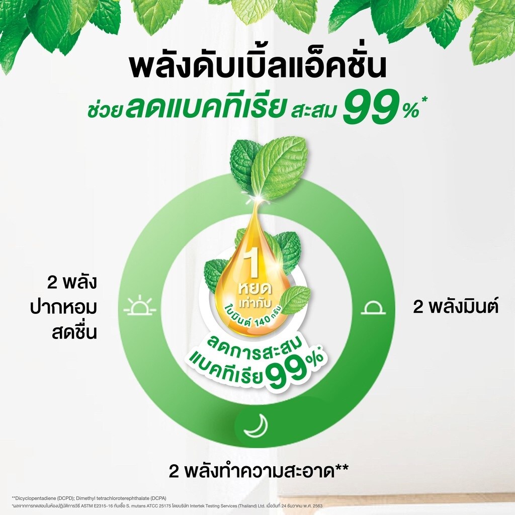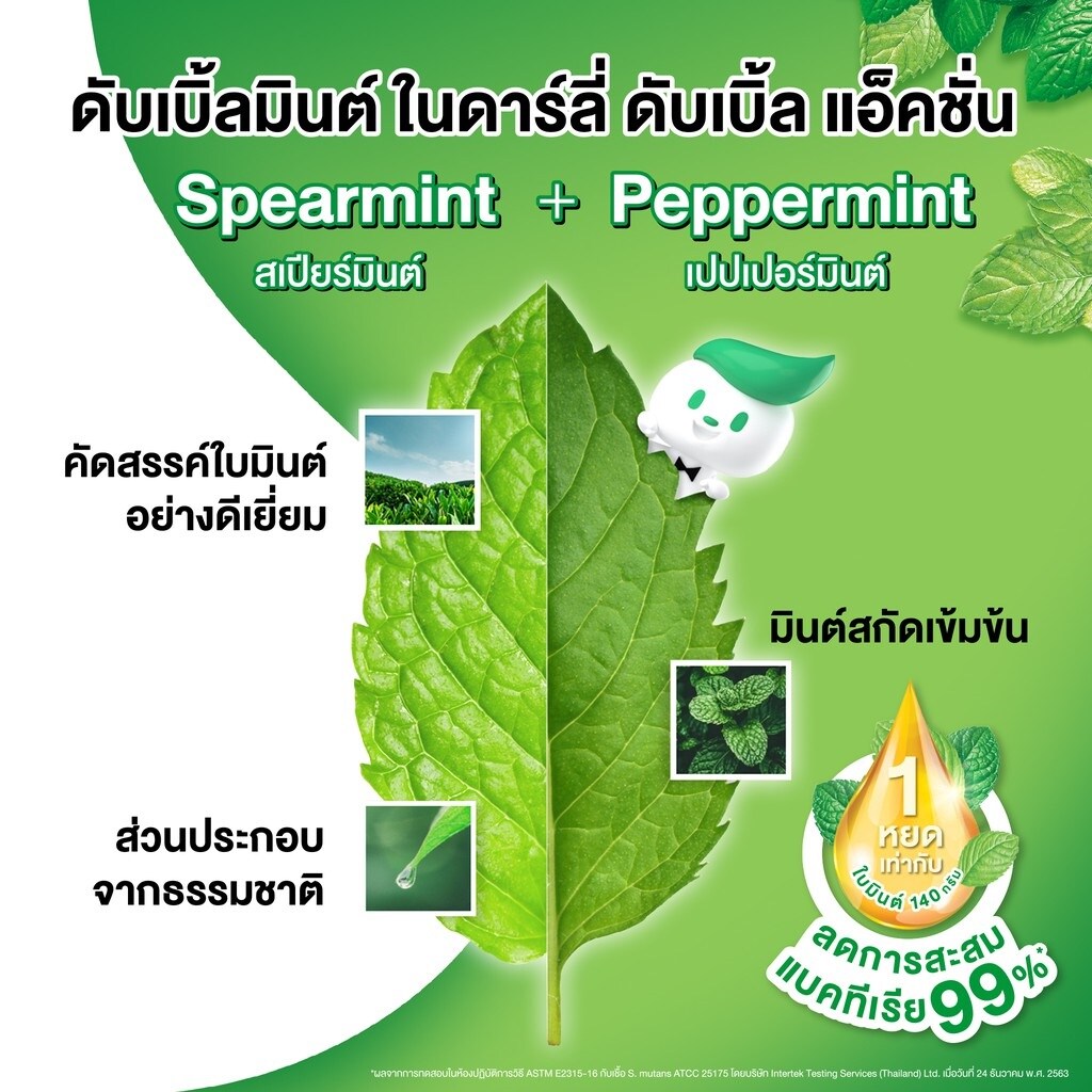 Darlie Toothpaste Double Action Double Mints essenses helps reduce oral bacteria accumulation 99% for fresh breath and clean oral health Spearmint and Peppermint are exquisitely selected from every 140g of mint, only around 1 gram of Double Mint is extracted, which helps reduce oral bacteria accumulation 99% for fresh and clean oral health Brush your teeth at least twice a day. Do not swallow. Rinse and spit out after use. Refer to vitro test with ASTM E2315-16 method on S. mutans ATCC 25175 by Intertek Testing Services (Thailand) Ltd.on 24 Dec 2020