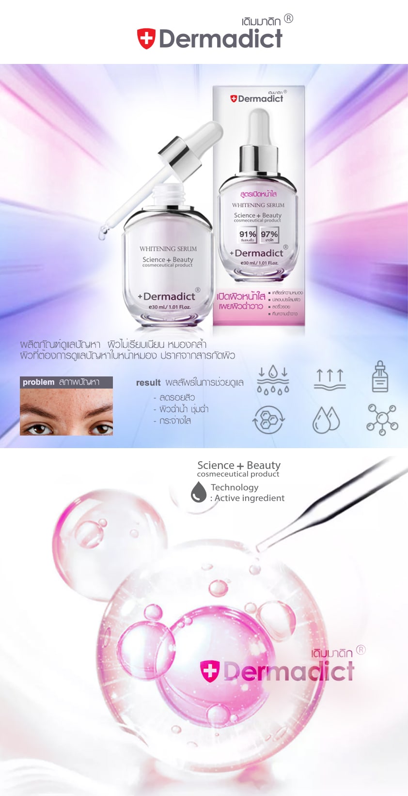 เดิมมาดิก ไวท์เทนนิ่ง ซีรั่ม สำหรับบำรุงผิว กู้ผิวกระจ่างใส คืนความชุ่มชิ้นกับผิว ซีรั่มช่วยบำรุงแม้ผิวที่บอบบางแพ้ง่ายมากๆฟื้นบำรุงผิวที่บอบบาง แพ้ง่าย ลดเลือนรอยแดงและรอยดำบำรุงผิวให้นุ่มชุ่มชื้น โดยไม่ระคายเคือง ไม่เหนียวเหนอะหนะ ปราศจากแอลกอฮอร์ เนื้อเกลี่ยง่าย สูตรน้ำ ไม่ทำให้อุดตันรูขุมขน เหมาะกับทุกสภาพผิว คำเตือน 1.อ่านวิธีใช้ให้ละเอียดและปฏิบัติตามอย่างเคร่งครัด ควรเก็บให้พ้นแสง 2.ผลิตภัณฑ์นี้มีสารก่อให้เกิดการระคายเคืองได้น้อยมาก 3. หากใช้แล้วมีความผิดปกติใดๆ เกิดขึ้นต้องหยุดใช้และปรึกษาแพทย์