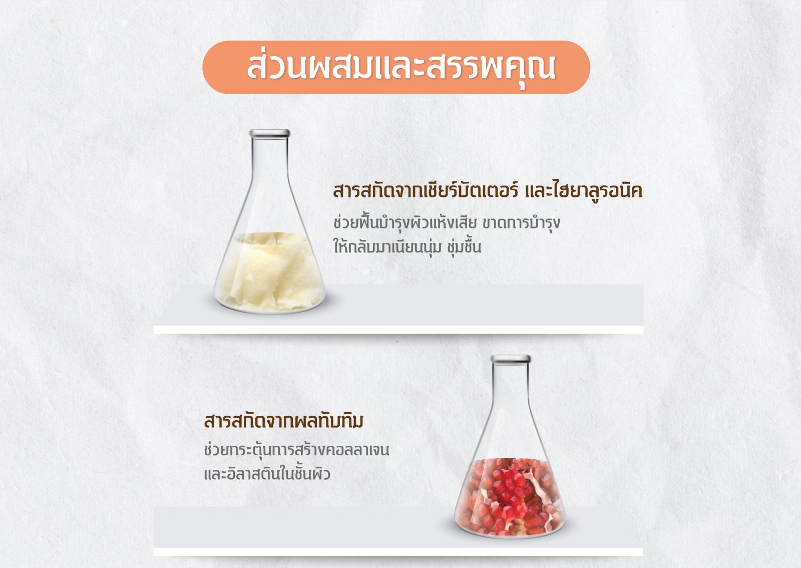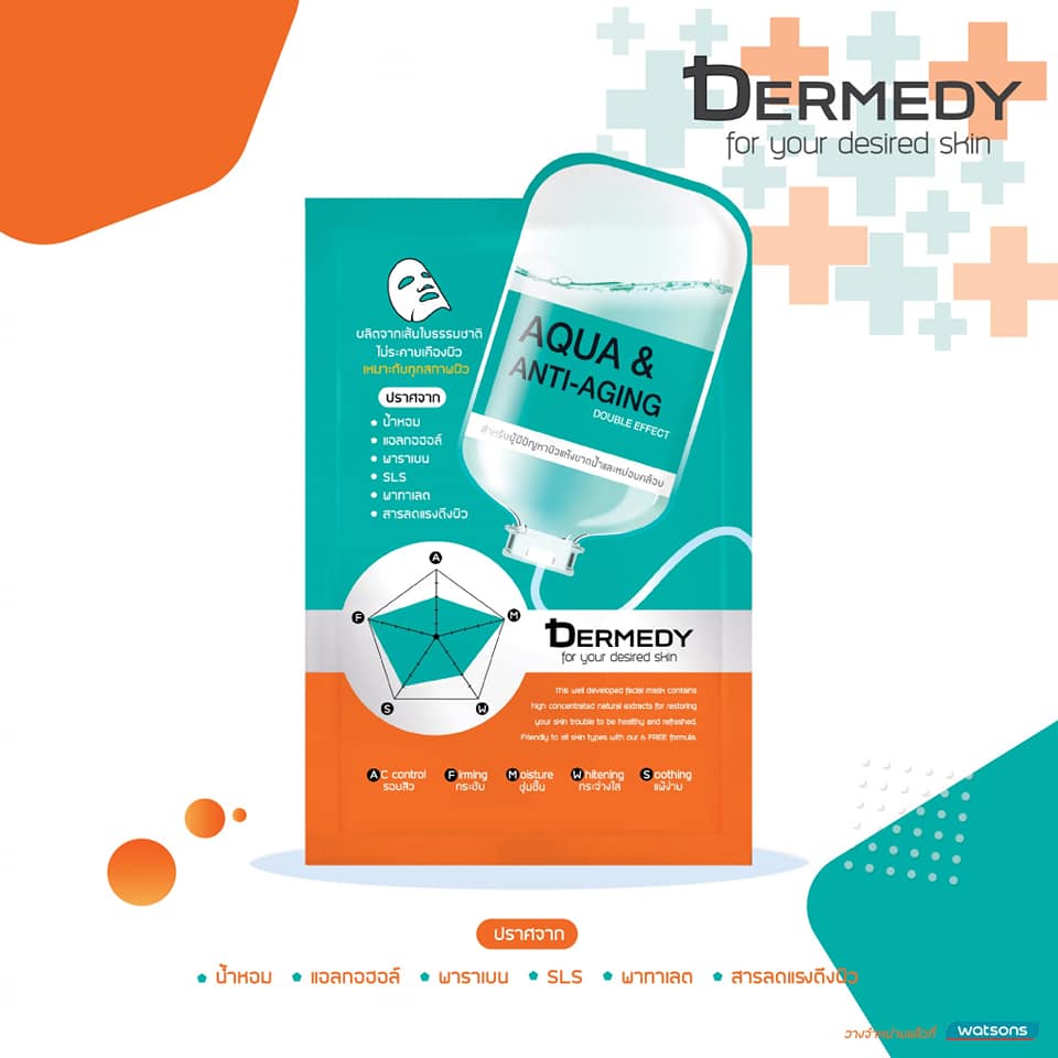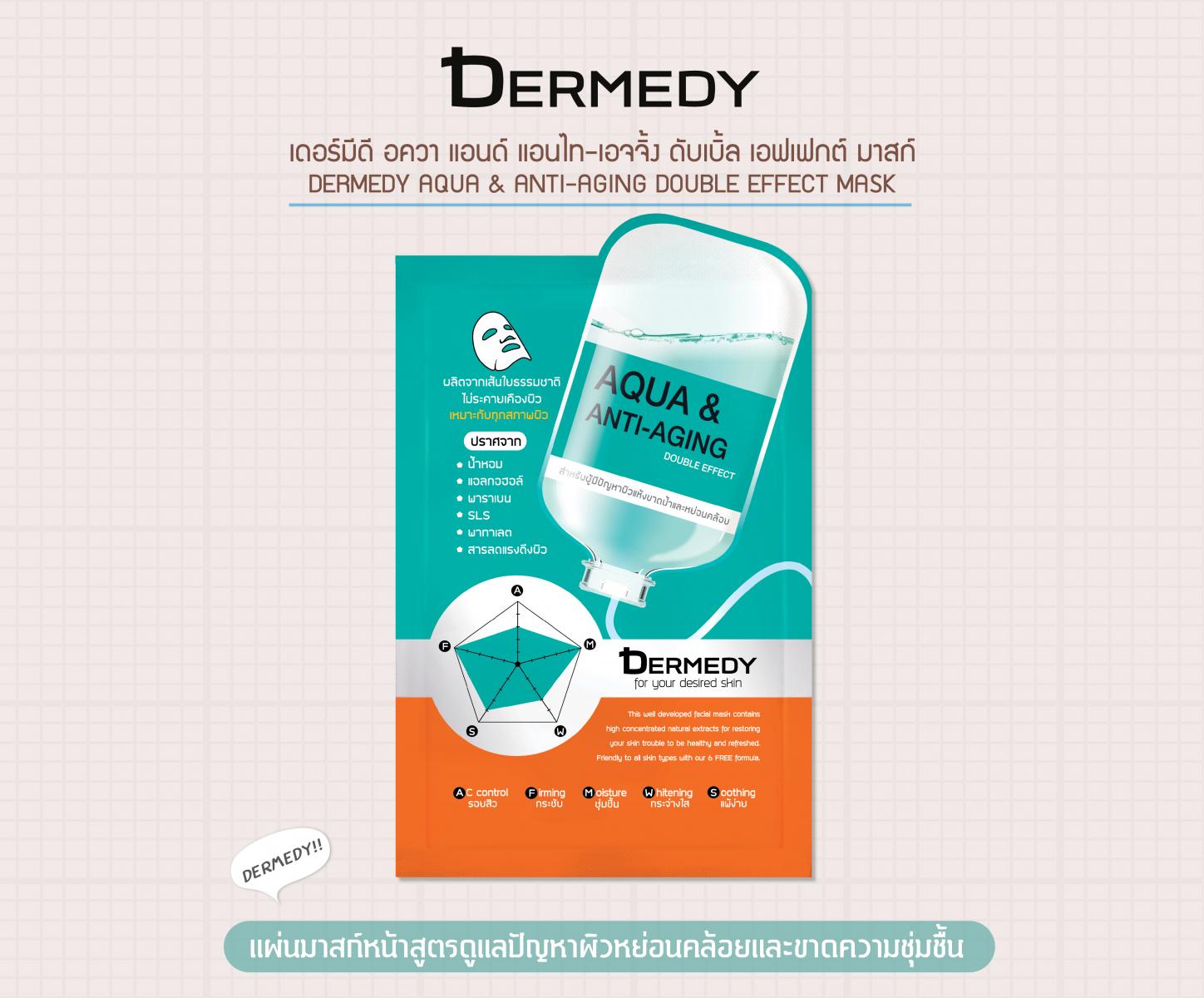 “Dermedy Aqua & Anti-Aging Double Effect Mask”, a rejuvenating and moisturizing facial mask. Shea Butter and Hyaluronic Acid, a powerful hydrating active, restore dry and rough skin to be hydrated. Antioxidant from Pomegranate, Aloe Vera and Hydrolyzed Collagen generate skin collagen and elastin to improve skin elasticity. Suitable for dehydrated with lack of firmness skin to be firming, hydrated and healthy.