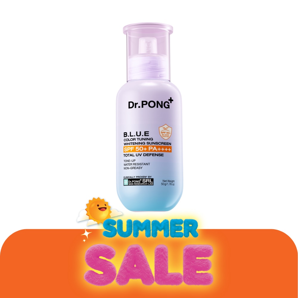 Dr.Pong+ B.L.U.E. Color Tuning Whitening Sunscreen SPF50+ PA++++ Dualsize physical sunscreen Powerful defense with Tone-up effect for a naturally luminous glow. Broad spectrum protection and skin brightening. Dermatologist tested. Gentle daily formula, Suitable for all activities.