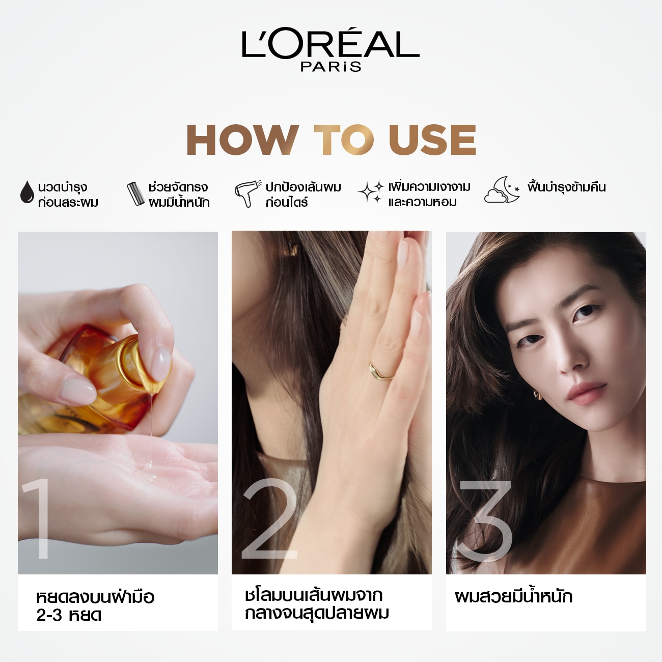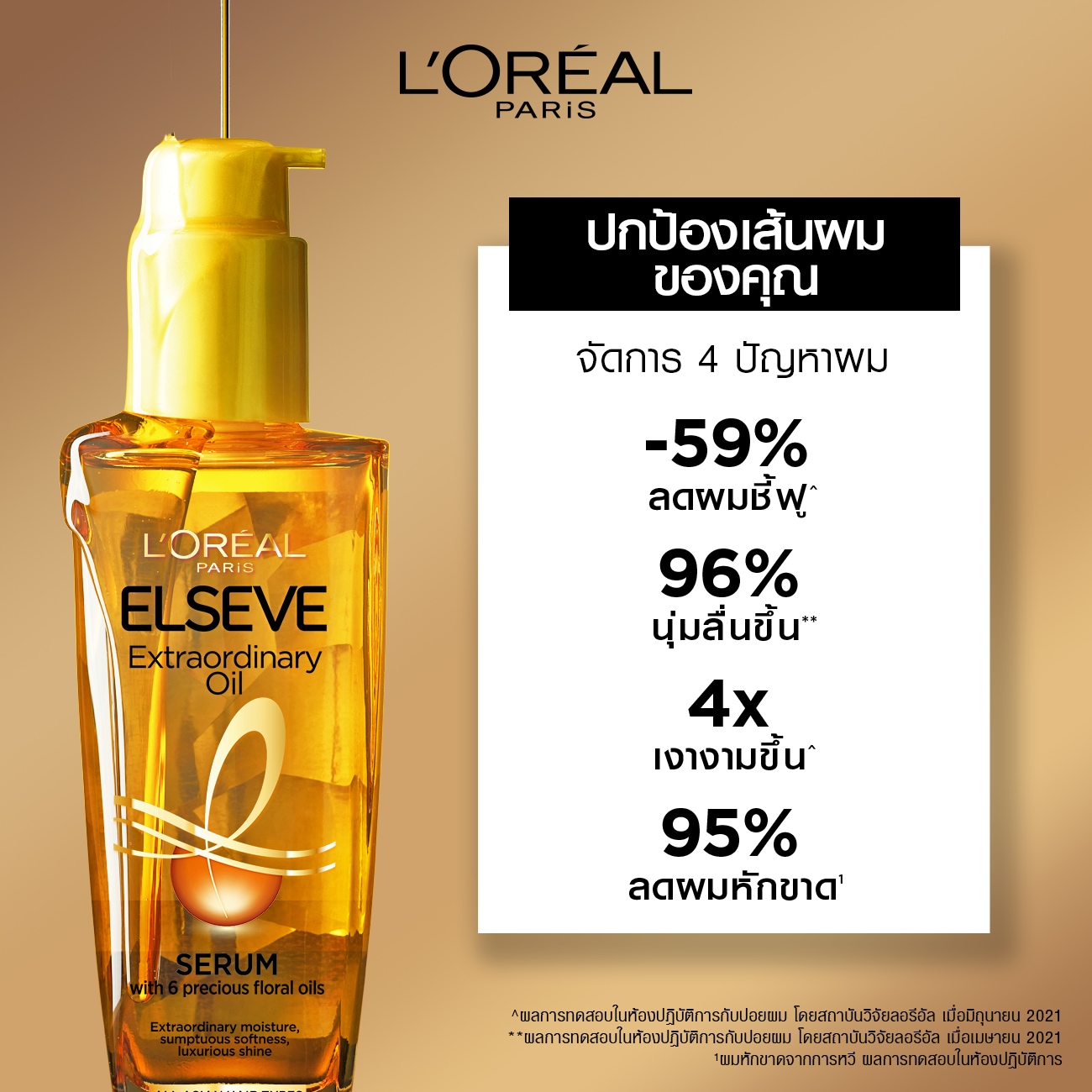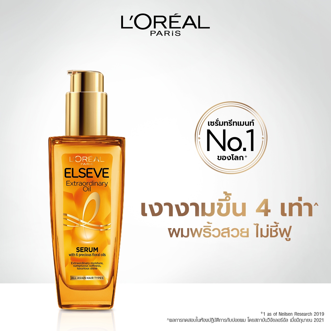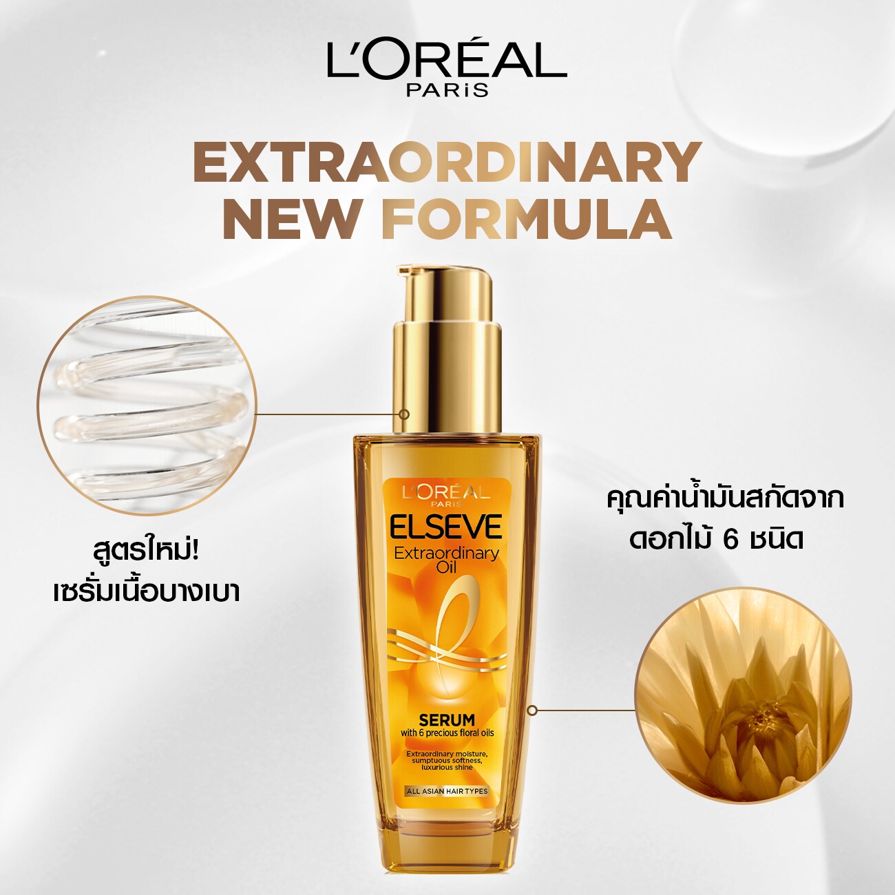 L'Oreal Paris Elseve Extraordinary Oil Serum With 6 Precious Floral Oils Our 1st astonishingly versatile hair oil, enriched with a blend of 6 precious flower extracts. Its your daily shortcut to perfect-looking hair. 108 usages Anytime Anywhere 1. Before shampoo as it melts into the hair, nourishes profusely leaving hair incredibly soft and shinny 2. Before blow dry as it smoothes, detangles, leaving hair incredibly manageable and shinny 3. As a finishing touch, it banishes flyaways, leaving hair irresistably flowing and shinny.
