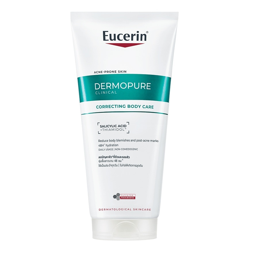 EUCERIN DERMOPURE CLINICAL CORRECTING BODY CARE. CLINICALLY TESTED FORMULA This concentrated serum in a cream is recommended to reduce body imperfections. It contains a unique combination of dermo-actives Salicylic acid (BHA), Thiamidol and Squalane. CLINICAL EFFICACY Clinically tested to reduce blemishes on back, chest and shoulders while maintaining the skin microbiome and moisturizing the skin for 48 hours.
