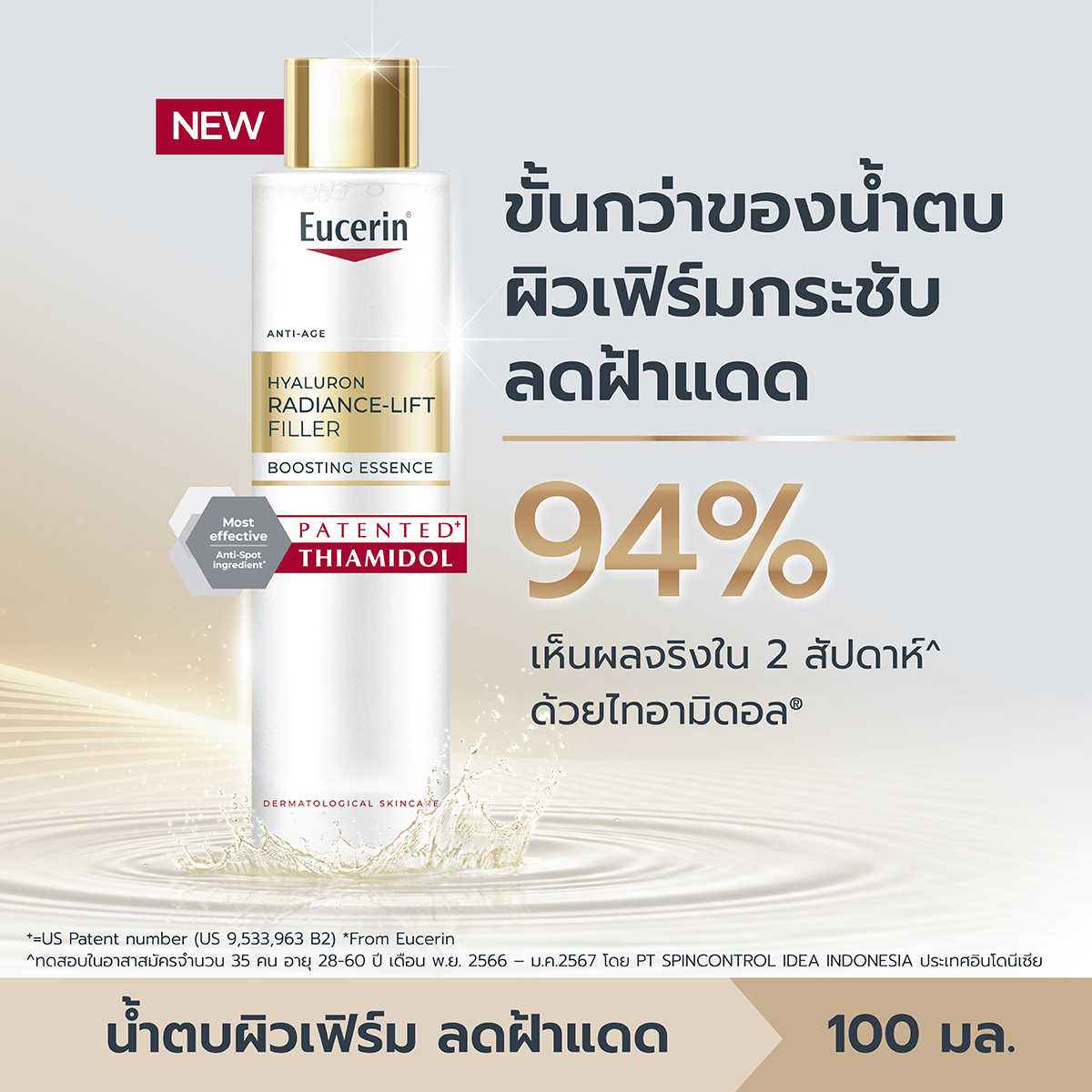 Eucerin Anti Age Hyaluron Radiance Lift Filler Boosting Essence The Innovation Skin looks firmer brighter and healthier. Age spots reduced with 1st visible results within 2 weeks. Anti Age with 3 HA combo comprising three distinct sizes of Hyaluronic Acid. The trio functions on various levels within the epidermis hydrating volumizing and filling in Hyaluron to effectively moisturize and plump up fine lines and diminish wrinkles. Brighten Skin with Thiamidol is proven to effectively reduce darks spots and correct uneven skin at the root cause. Skin Barrier Strengthen with Panthenol and Ectoin fortify the skin making it stronger and more resilient and help to stabilize the overall condition of the skin improving its appearance and function