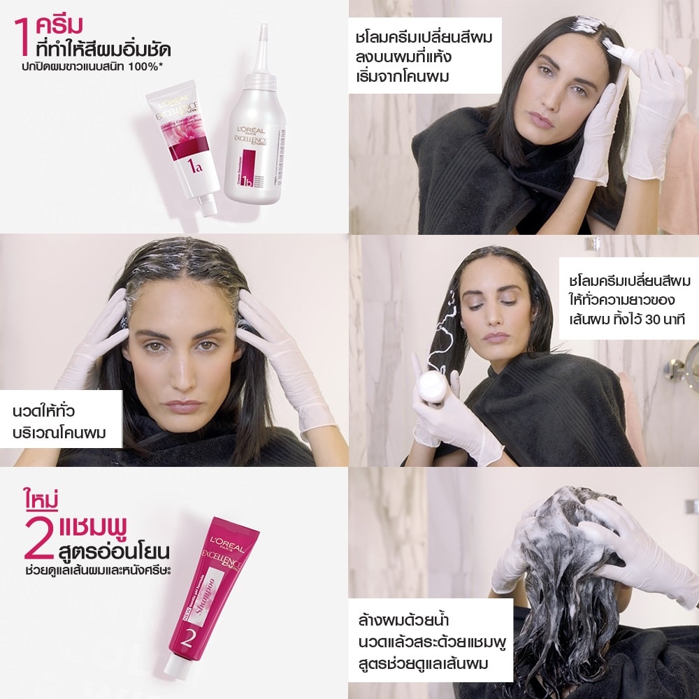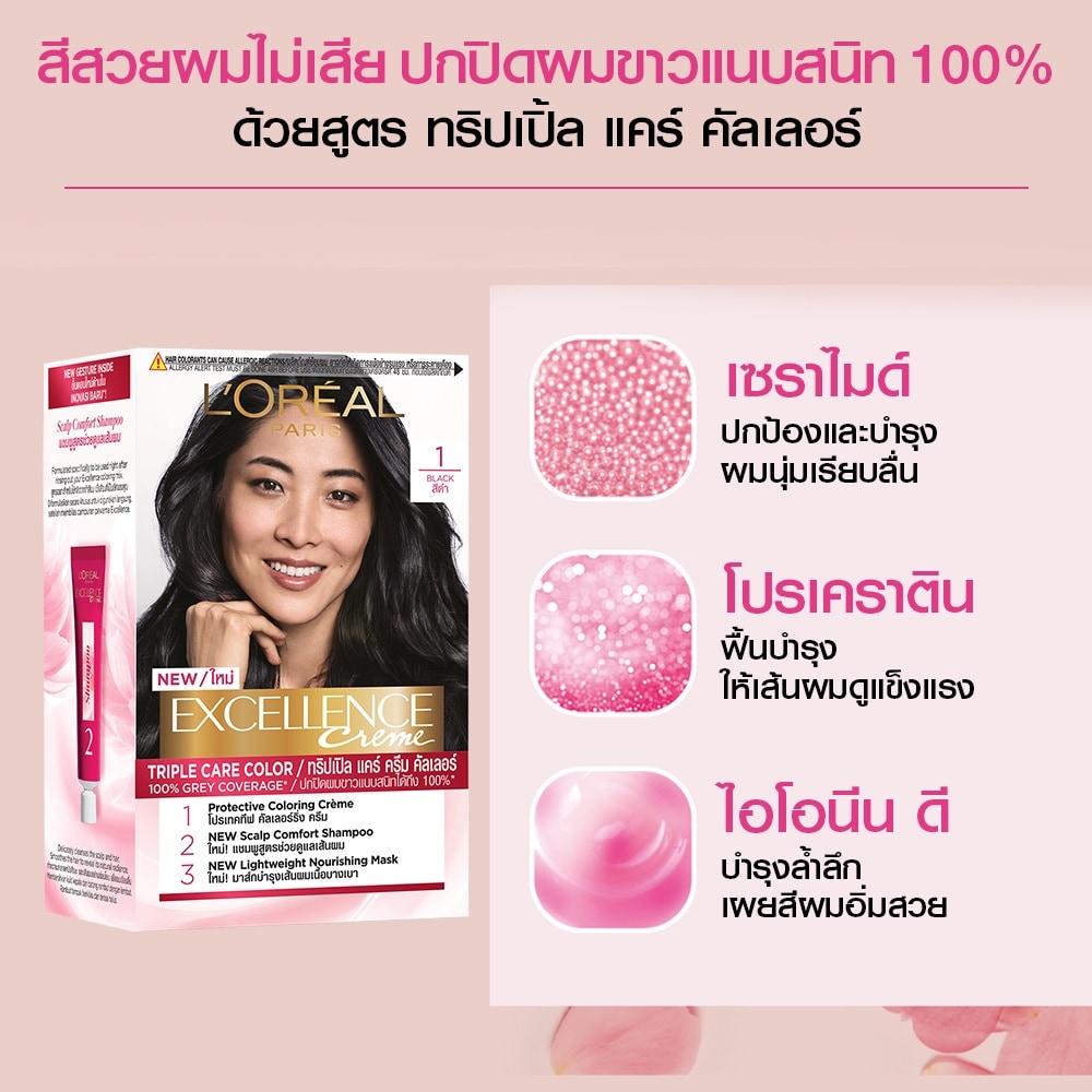 Triple Care Colour Ritual Hair Dye by Excellence Cares for your colour. Cares for your scalp.Cares for your hair. 1. Colouring Cream Enriched with Pro-Keratin. Protects the hair as it colours. Long-lasting, multi-tonal colour. 2. Gentle Post-Colour Shampoo Delicately cleanses the scalp and hair by gently rinsing away excess residue. Smooths the hair to reveal its radiance. Natural, multi-tonal colour result. Formulated specifically to be used right after colouring your hair 3. Nouriching Mask Infused with conditioning ingredients. Intensively nourishes the hair without weighing it down.