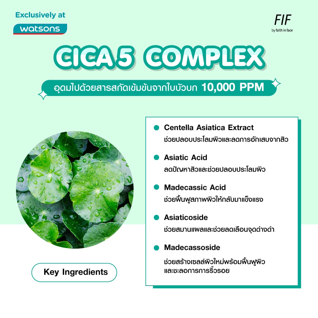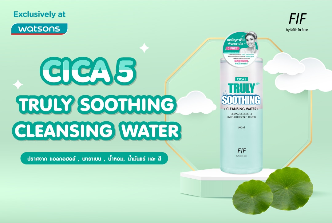 FIF By Faith in Face Cica5 Truly Soothing Cleansing Water Contains 10000 ppm of Cica 5 complex to calm skin redness and soothe irritated skin. By adding Centella Asiatica Extract with other four effective ingredient of Cica. Helps anti inflammation recover damaged and troubled skin. Maximize the skin soothing effect. Dermatologist Tested No added Paraben Alcohol Mineral Oil Color 1. Saturate a cotton pad and gently sweep across skin to cleanse 2. Leave cotton pad over eye area around 10 seconds for easier cleansing 3. No rinsing necessary but rinse with lukewarm water if desired.