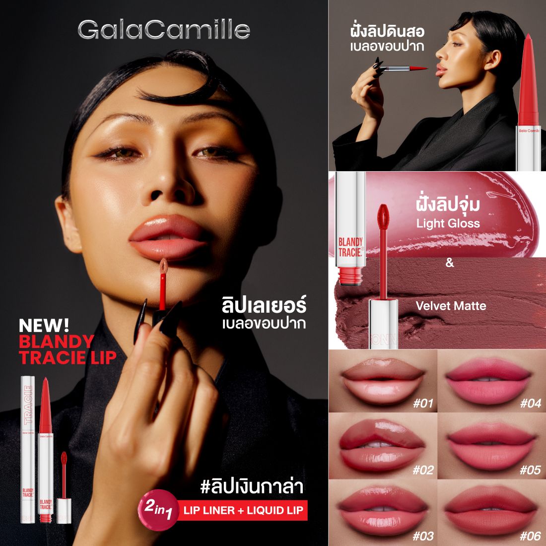 Gala Camille Blandy Tracie Lip 2 In 1 Lipstick Lip Liner + Liquid Liptracie Lip - Lip Liner A Sharp Tip With A Twist Up And Down Feature Creamy And Smooth Texture Which Is Easy To Line And Blend Adjusting The Shape Of The Mouth To Look Fuller And Blurring The Mouth Edge To Look Softer Blandy Lip - Liquid Lip Slender Sponge Dip Head That Fits The Mouth Shape Light Gloss Texture Feeling Light On The Lips With Shiny Finish And Making The Lips Full Moist, And Not Dry Or Tight Velvet Matte Texture Feeling Soft Smooth And Comfortable On The Lips With Clear Pigments Long Lasting Lips Blurring And Covering The Original Lips Color