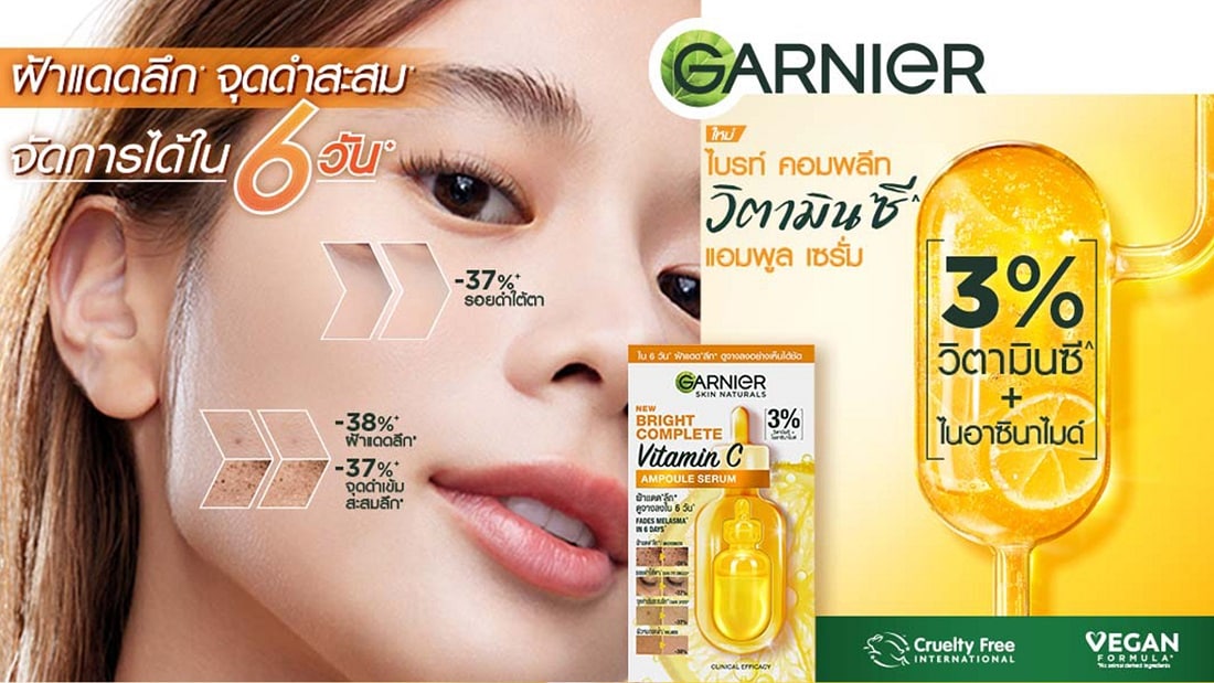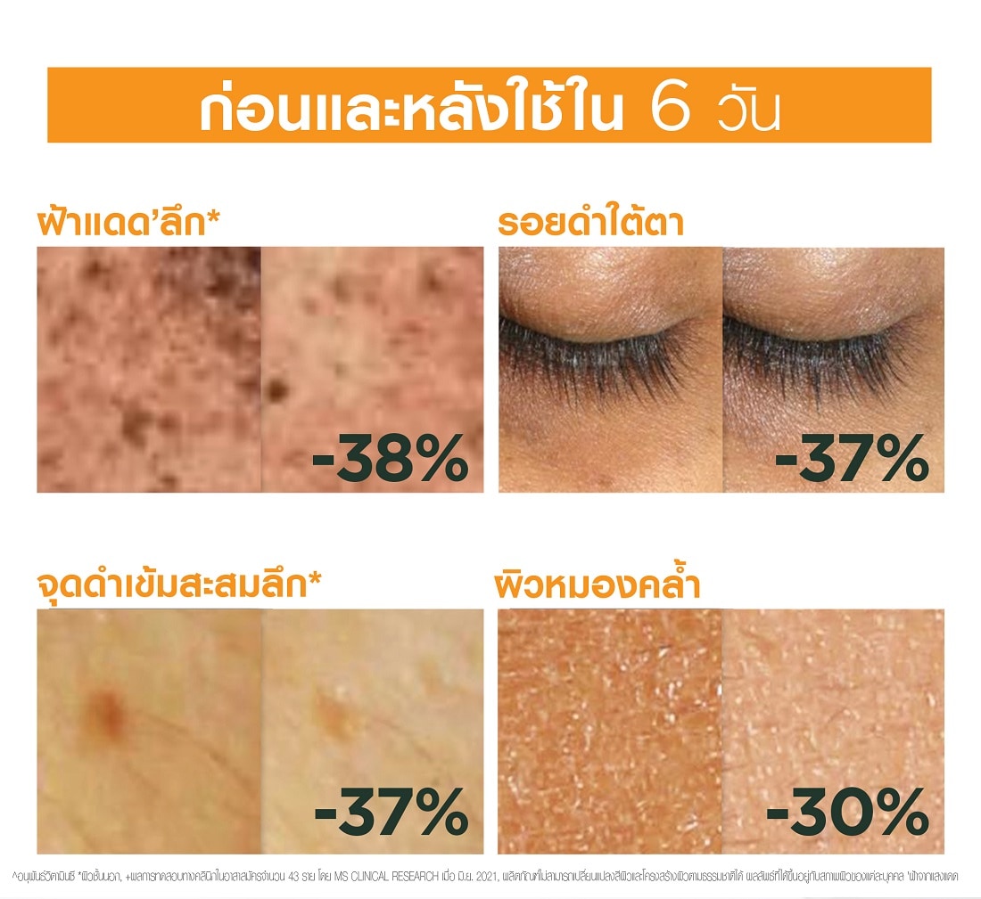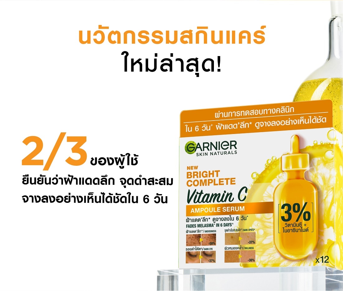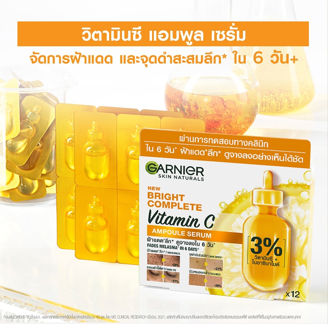 Garnier Skin Naturals Bright Complete Vitamin C Ampoule Serum with 3% Vitamin C and Niacinamide, clinically proven to reduce Melasma and brightens skin. From the 1st dose, instant bright effect. In just 6 days, Proven from real users, in 6 days - Deep Sun Melasma fades -38% - Deep Dark Spot fades -37% - Reduction in dark eye circles -37% - Reduction in dullness -30% Clinicallly Proven that suits with every skin type Melasma from sunlight basis colour intensity based on clinical study Note Actual pictures from clinical, individual results may vary.