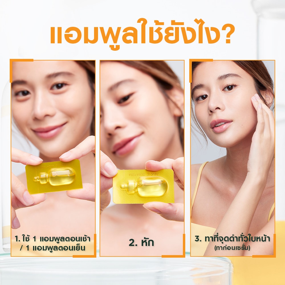 Apply all over cleansed face, especially on areas of concerns by gently massaging it in. To open, hold the Ampoule Serum upright, push back the top tab then squeeze. Apply 1 Ampoule in the morning and another ampoule at night for best results in 6 days.
