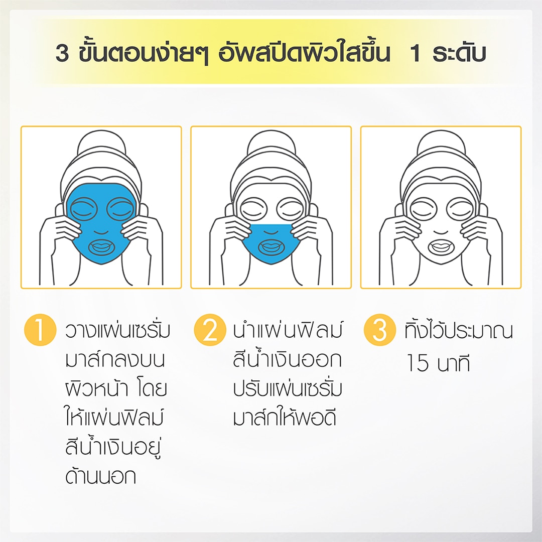 Unfold mask. Apply on clean face withthe blue protective film facing outwards.Remove the protective film. Adjust themask contours on your face.Leave it on for 15 minutes.Remove mask, and wipe off any excess milkyessence with a cotton pad.