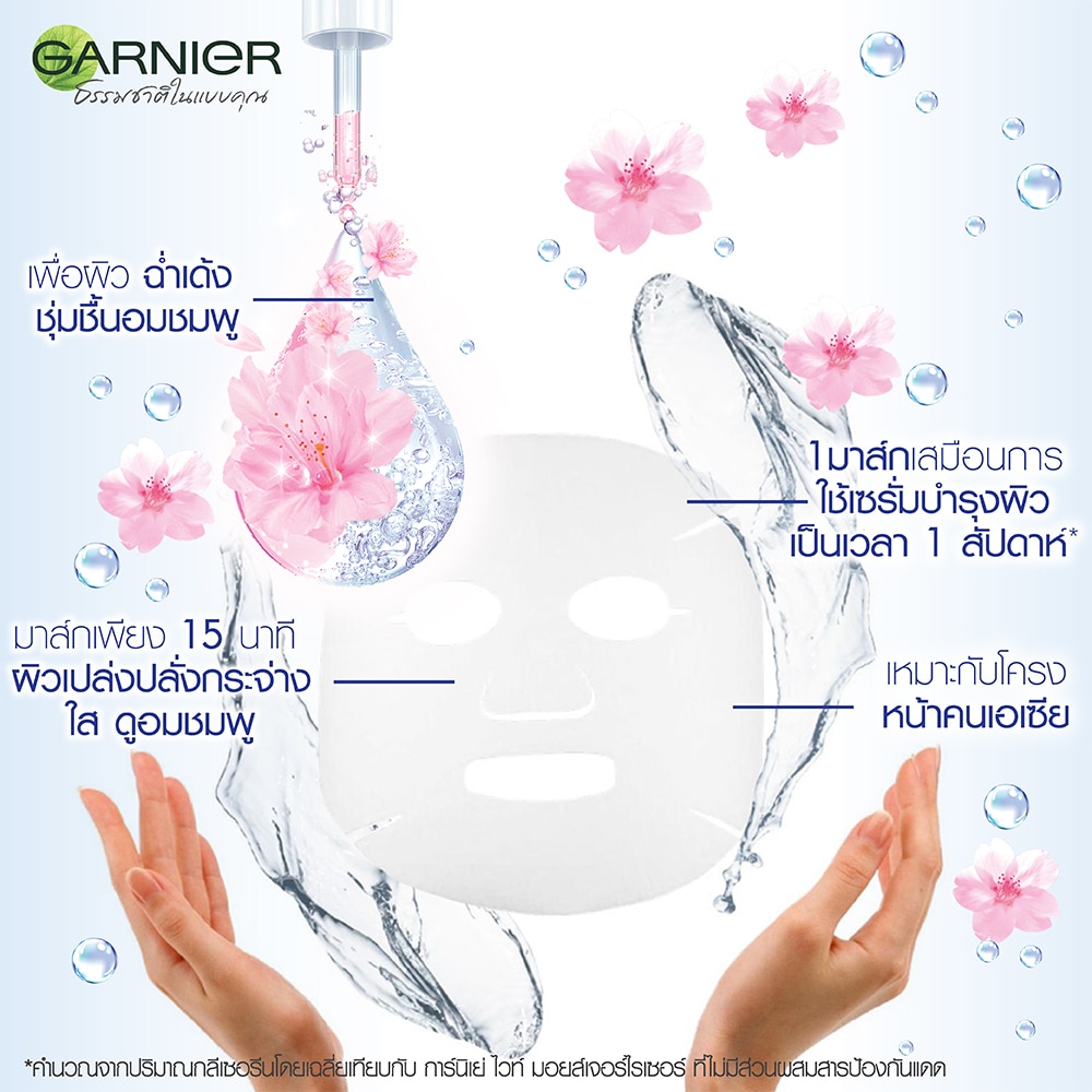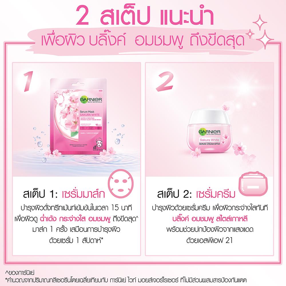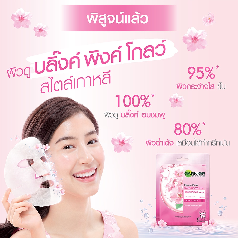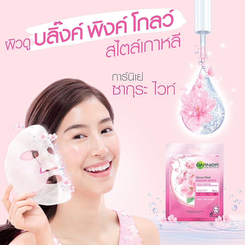 SERUM MASK: A new generation** of tissue mask that infuses skin with 1 week of serum in 1 mask*. A true innovation, its tissue is enriched with pinkish glow-boosting Japanese Sakura & Hyaluronic Acid, a powerful hydrating active capable of retaining 1000x its weight in water. Designed to fit Asian facial contours. Suitable for dull skin, looking for an efficient yet pampering solution to instantly refresh skin & reveal its pinkish glow. Recommend to use 3 times a week.