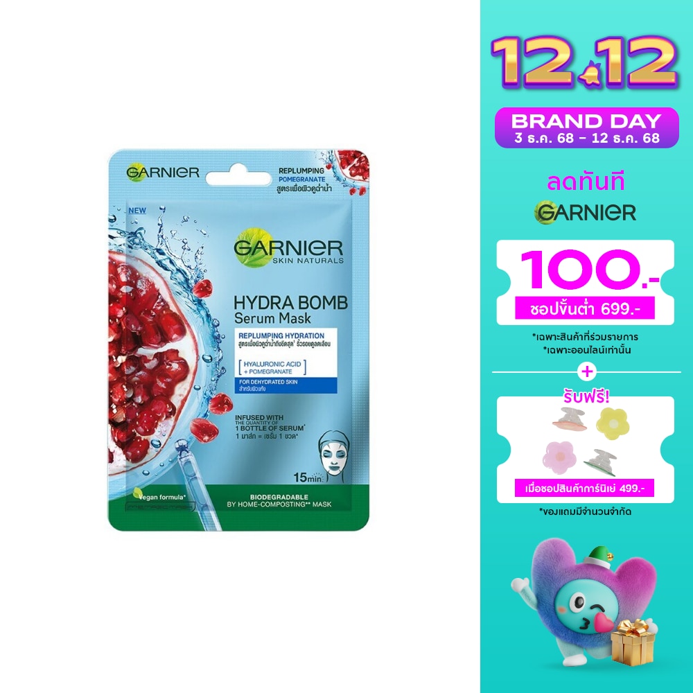 Garnier Skin Naturals Serum Mask Hydra Bomb Replumping Hydration Serum mask A new generation of tissue mask that infuses skin with 1 week of serum in 1 mask. A true innovation, its tissue is enriched with Antioxidant Pomegranate Hyaluronic Acid, a powerful hydrating active capable of retaining 1000x its weight in water. Designed to fit Asian facial contours. Suitable for dehydrated skin, looking for an efficient yet pampering solution to instantly refresh amp; revitalise skin. Recommend to use 3 times a week.Calculated from average rate of glycerine in Garnier Sakura white non-SPF moisturizer superficial layers of epidermis vertical-align: superwith Garnie Why yoursquoll love it Proven efficacy After 15 mins Skin intensely re-hydrated, Skin looks smoother, Complexion more radiant After 1 week: Fine lines appear reduced, Skin looks plumper, Skin is revitalized