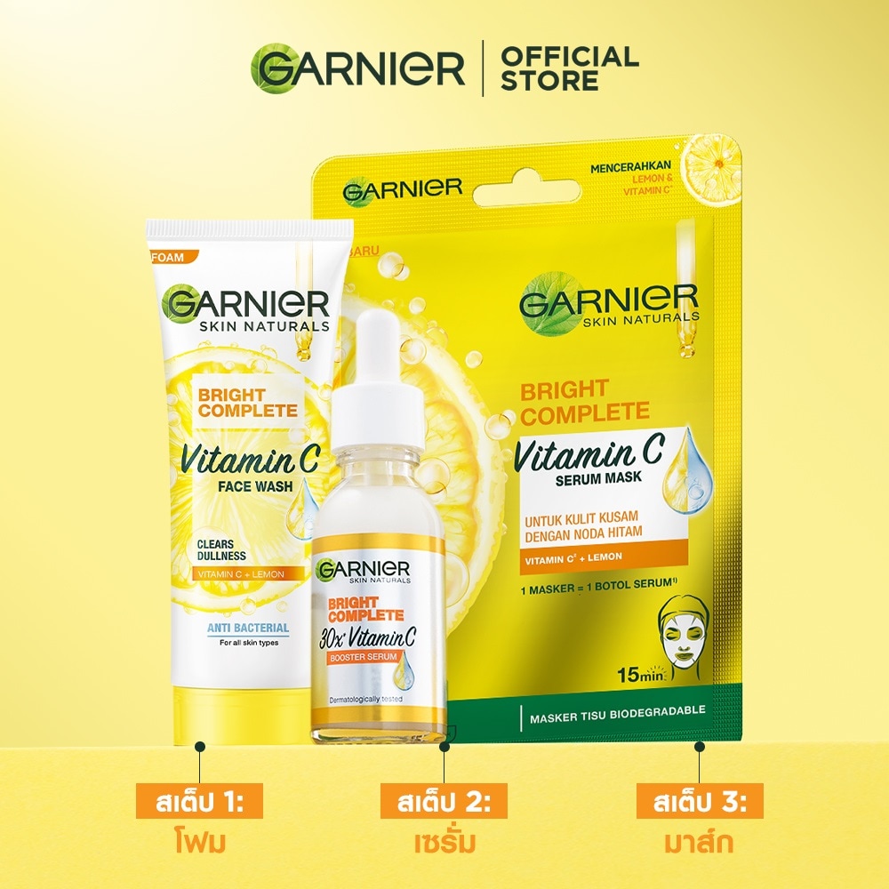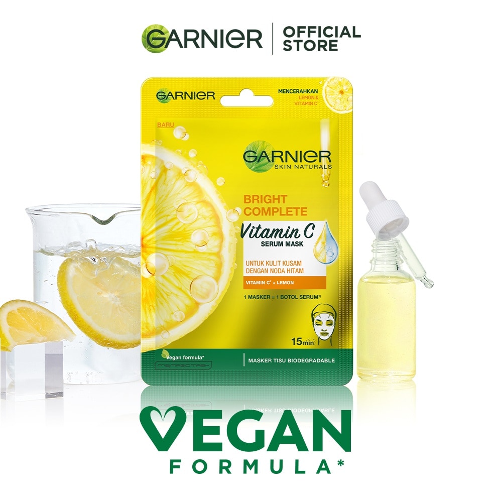 Garnier Skin Naturals Bright Complete Vitamin C Serum Mask A new generation** of tissue mask that infuses skin with 1 week of serum in 1 mask*, A true innovation, its tissue is enriched with brightening Pure Lemon Extract, Vitamin C Hyaluronic Acid, a powerful hydrating active capable of retaining 1000x its weigh in water. Designed to fit Asian facial contours. Suitable for dull skin with dark spots, looking for an efficient yet pampering solution to instantly refresh skin & reduce dullness. Recommend to use 3 times a week.**within Garnier *Calculated from the average rate of glycerin in Garnier sakura white non-SPF moisturizer superficial layers of epidermis Why you’ll love it: After 15 minutes: Skin is intensely rehydrated, looks visibly brighter, Complexion is smoother After 1 week: Skin has a radiant glow, even skin tone result, lighten dark spots