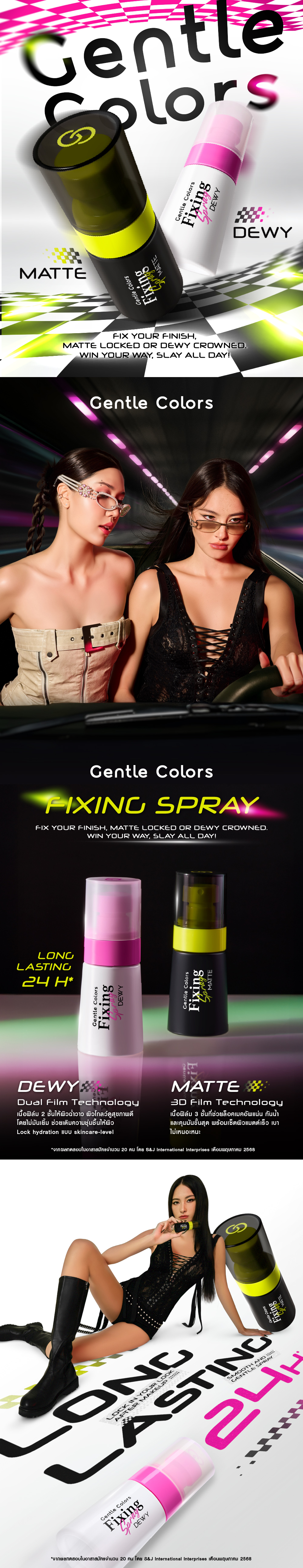 Gentle Colors Fixing Spray Dewy 30 ml A weightless, ultra-fine mist that locks in makeup with a radiant, dewy glow. Powered by Dual Film Technology for long-lasting wear and light-reflecting luminosity without patchiness or caking. Enriched with natural plant extracts to soothe, strengthen hydrate your skin for a healthy look. Gentle Colors Fixing Spray Dewy Before use shake the bottle thoroughly. Press the nozzle 4 to 6 times to evenly cover your entire face for setting makeup. A matte spray that locks makeup with a dewy formula with fine mist that is comfortable on the skin and helps makeup last longer without fading during the day with 3D Film Technology. It also controls oil on the skin without smudging. The natural plant-based nourishing ingredients help soothe the skin, making it strong and moisturized, giving it a healthy look. Gentle Color Fixing Spray, before use, spray the bottle thoroughly. Hold the university research bottle at half-arm length and press the spray 4 to 6 times all over the face to set the makeup.