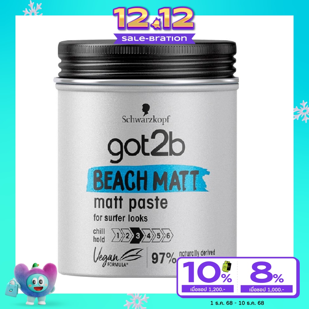 Schwarzkopf Got2b Beach Matt Matt Paste creates a textured look with medium hold and no stickiness. The matte finish allows hair to look effortlessly put together. Tousle your hair with enough hold to keep your look in place all day. - For a tousled and textured look - Medium hold - No stickiness, no residue, easy to brush out - Matte finish Use on damp or dry hair - Rub into your palms and tousle, flatten or twist single sections of hair as you like. Get the surf style look Whether tousled, dishevelled, tame or straight - main thing its matt. For surfer styles with medium hold, this matt-effect texturising paste is right for you.