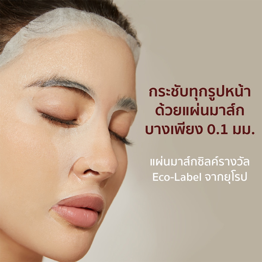 The revolutionary mask combining both superior qualities of the sheet mask and powerful anti-aging serum The invisible silk mask – the natural fiber regenerated from wood: • Ultra safe and gentle for skin. awarded the european community ecolabel environmental standard • Perfect fit for all facial shapes with super soft and thin (0.1 mm) sheet mask • With no gaps between mask and skin, pores are opened for full serum absorption Super anti-aging serum power : Royal jelly : • Boost collagen growth ? Caviar extract : • Reduce fine lines and wrinkles Zinc : • Reduce oil and minimize pores ? Collagen : • Restore skin elasticity • Promote firmer skin Dermatologically-tested • No alcohol • No paraben • No fragrance