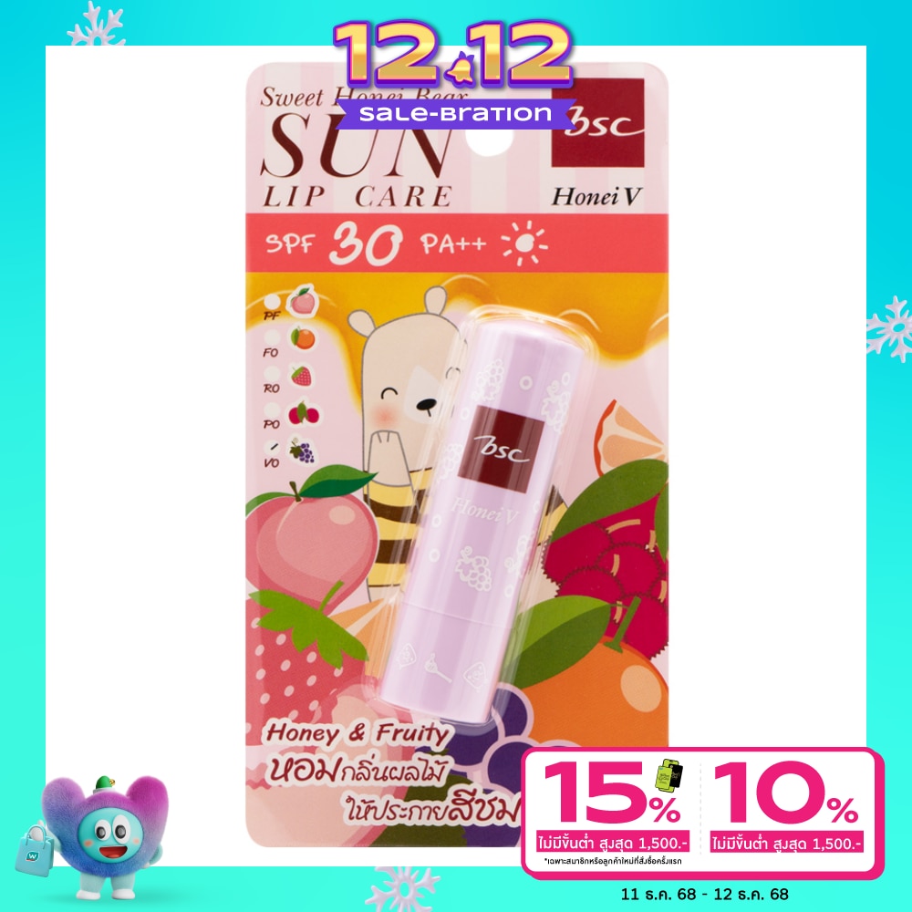 Honei v bsc Sun Lipcare SPF30 PA++ with fruity fragrant gives a natural pink glow and a soft and smooth texture to your lips while protecting them from the sun with SPF30PA++ and replenishes moisture to lips with Honey is rich in nutrients such as vitamins such as Vitamin E and minerals helps to provide nourishes the lips to become soft and moist with Sodium Hyaluronate to moisture retention Lips will be soft smooth moisturized radiant and looking naturally plump and healthy Fruity fragrant 5 Scents F0 Orange P0 Lynchee PF Peach R0 Strawberry and V0 Grape