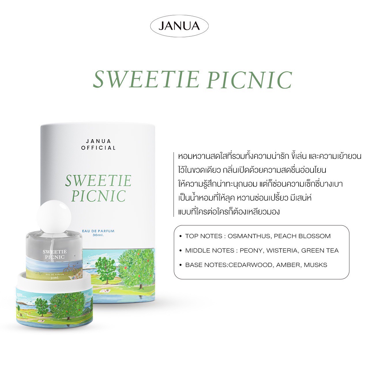 Janua Sweetie Picnic Perfume 30ml. A floral fragrance with notes of peony and lilac. It's a versatile scent that balances a sweet sexy and alluring charm with a fresh playful and youthful innocence. The light refreshing aroma evokes a delicate and cherished persona without being overly sweet or childlike. This scent has both looks sweet sexy charming and alluring and a scent that gives off a feeling of a bright young lady. The scent of peony and lilac makes you look fresh light and refreshed making you look small and lovable but not too sweet or cute. The scent doesn't offend those around you and can be used for any occasion.