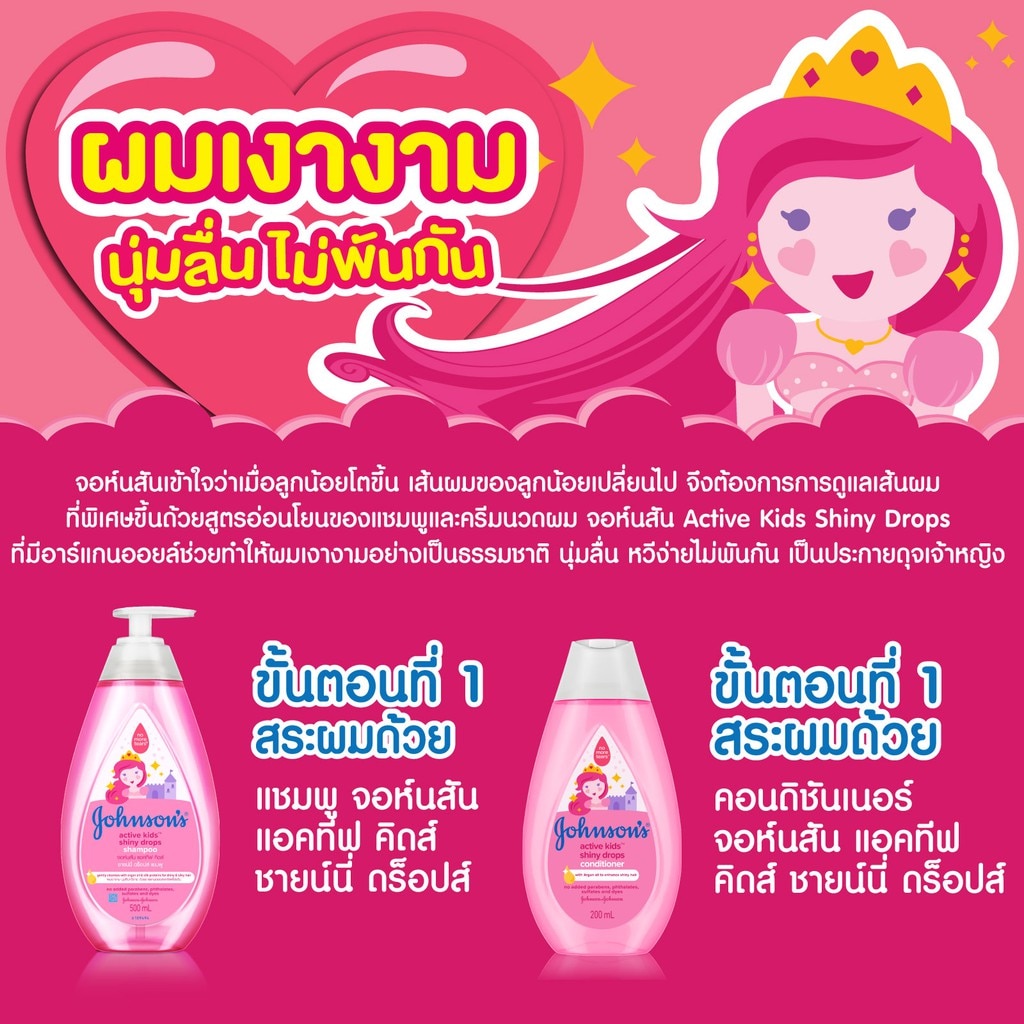 Wet child’s hair with warm water, apply shampoo, gently lather and rinse. For even better results, use with Johnson’s® Active Kids Shiny Drops Conditioner.