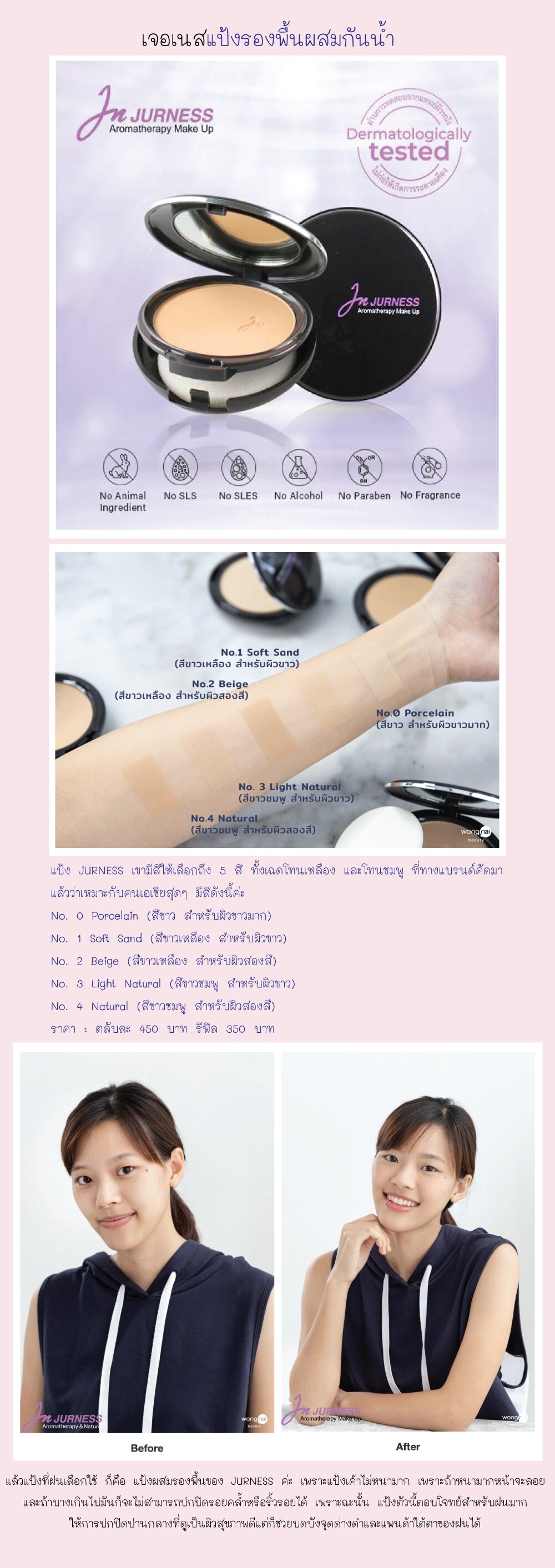 JURNESS Aromatherapy Foundation Powder SPF 25 PA ++ - Water resistant - treated powder pigment from Japan. - Lavender Essential Oil Aroma Sensed - Manufacture Standard : GMP, 14000, 22716, Halal. - Net Weight 12 g. - Dematologically tested. - 6 NO : No Animal Ingredient, No, Fragrance, No Paraben, No Alcohol, No SLS, No SLES. - Water & Sebum Resistant. - Medium Coverage. - Oil Control : Skin never become dull as Titanium Dioxide Encapsulated Silica helps to absorb the oil all day long. - Anti-Wrinkle : Enriched with natural ingredients ,Ginseng, Grape seed oil, Sweet almond oil, etc. No Skin irritation : Substitute synthetic fragrance by natural lavender essential oil. - Brightening : Skin become lighter as the light reflection effect of pearl pigment.