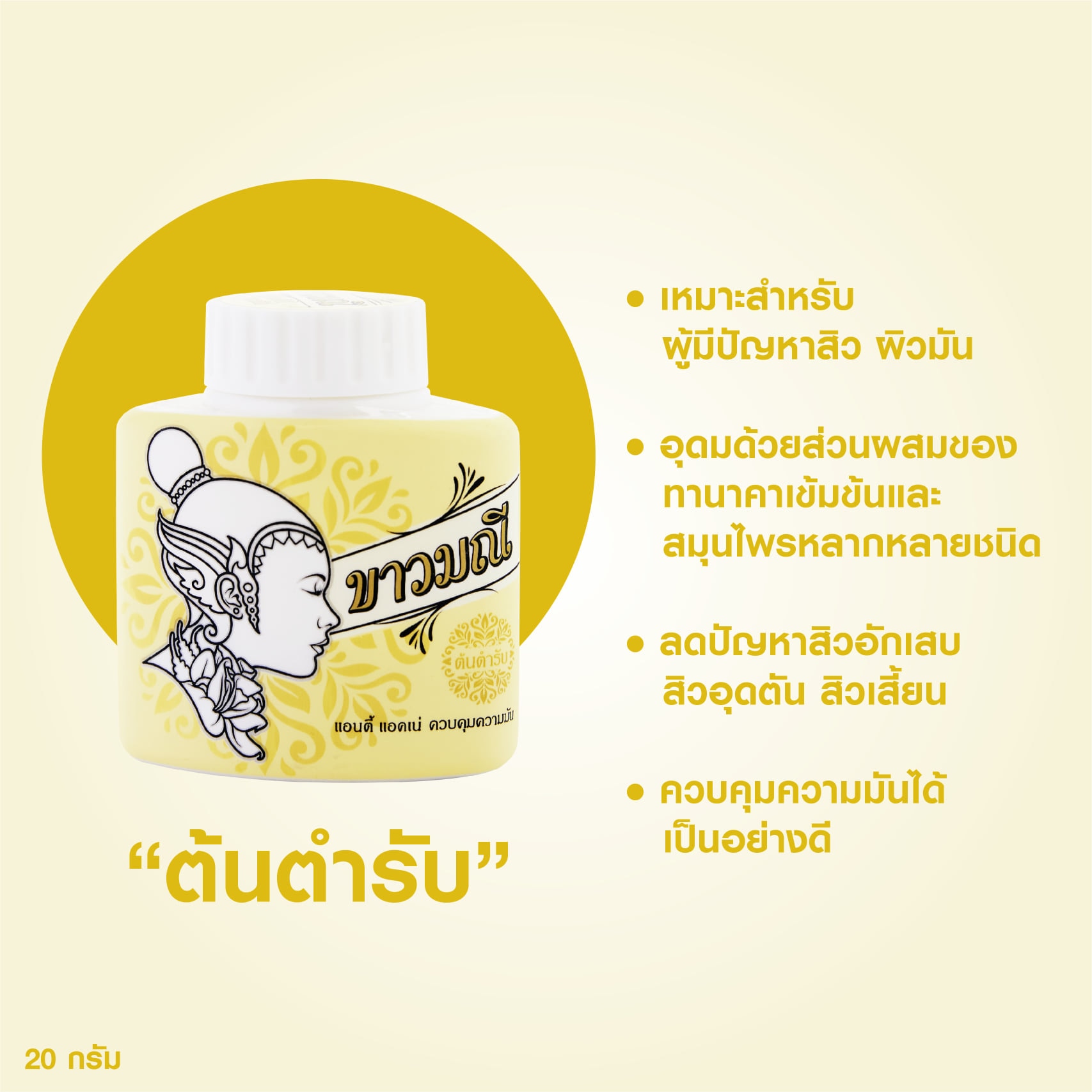 Kaowmanee Herbal Powder Original is the ideal for oily and acne-prone skin.It helps fight acnes, pimples and blackheads . The herbal translucent powder smooths your skin , reduces the apperance of pores, covers skin blemish or any imperfections, controls oil and shine for flawlessly matte throughout the day.It is suitable for all skin tones. 100% natural color from carefully selected Thanaka.