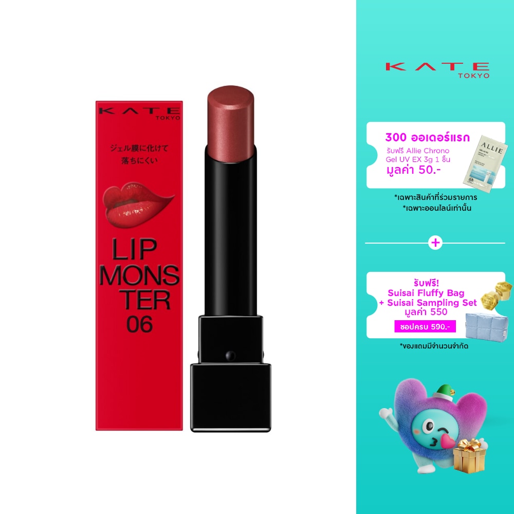 KATE Lip Monster 3g 06 2:00AM. Get both lasting effects and vivid coloration. A Lipstick thai doesnot fade. With colors lasting as they are. Vivid Coloration. Long Lasting. Highly Moisturizing. Secret behind lasting effects. Utilizes moisture that evaporates from the lips to create an adhesive gel film. Proprietary technology achieves long-lasting color. (Kanebo's proprietary color-lasting technology) With KATE LIP MONSTER that lasts. Won't easily come off even when wearing a mask. Less color gets on a cups when you drink.