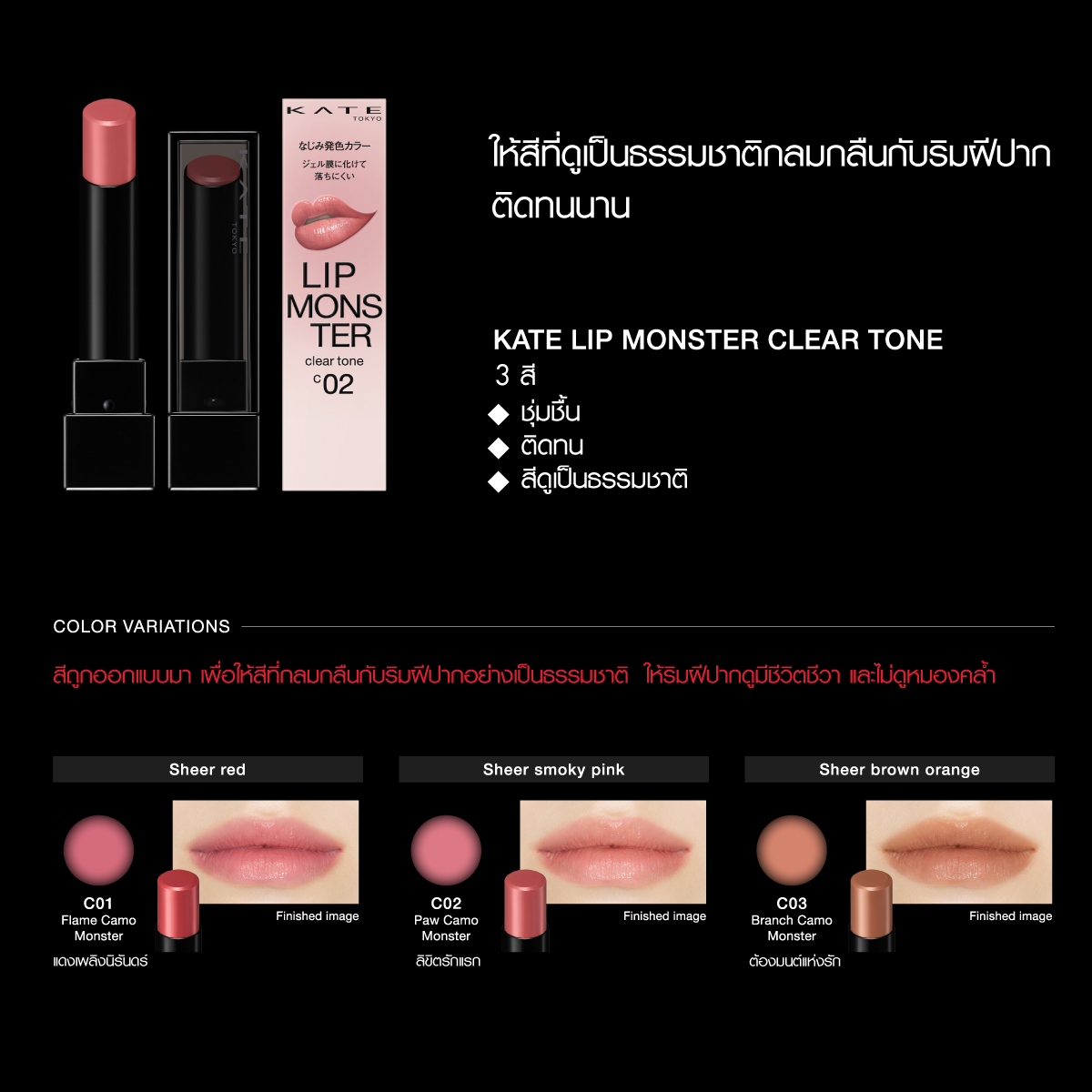 Kate Lip Monster Clear Tone C01 (Flame Camo Monster) 3g. Blending Color With Reduced Coloration Assimilates With The Color Of The Lips. The Color Lasts For Many Hours. Retains Moisturizing Effects And Lasting Colors Of The Kate Lip Monster Series As Is. Transforms Into An Adhesive Gel Film By Utilizing Moisture Evaporating From Lips To Achieve Long Lasting Color. Blending Coloration That Assimilates With Lip Color. Color And Gloss That Blend Naturally With Lips And Does Not Stand Out. Easy To Use. Regardless Of Gender. Color Design That Corrects Dullness And Improves Complexion. Product Features Moisturizing Long Lasting Coloration That Naturally Blends.